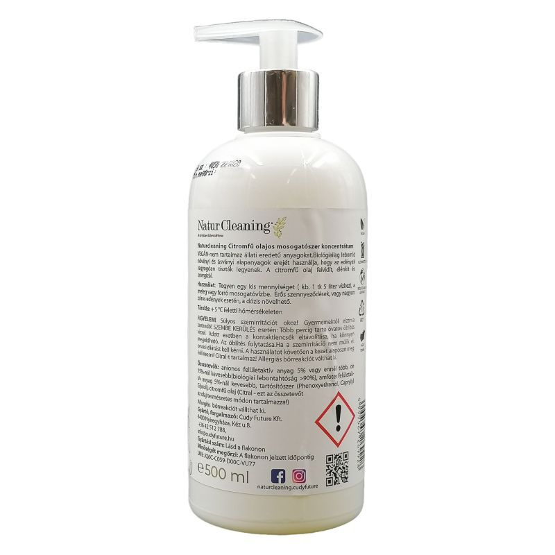 Anionos felületaktív anyag 5% vagy ennél több, de 15%-nál kevesebb(biológiai lebonthatóság>90%), amfoter felületaktív anyag 5%-nál kevesebb, tartósítószer (Phenoxyethanol, Caprylyl, Glycol), citromfő olaj(Citral-ezt az összetevőt az olaj természetes módon tartalmazza!) Allergiás bőrreakciót válthat ki!