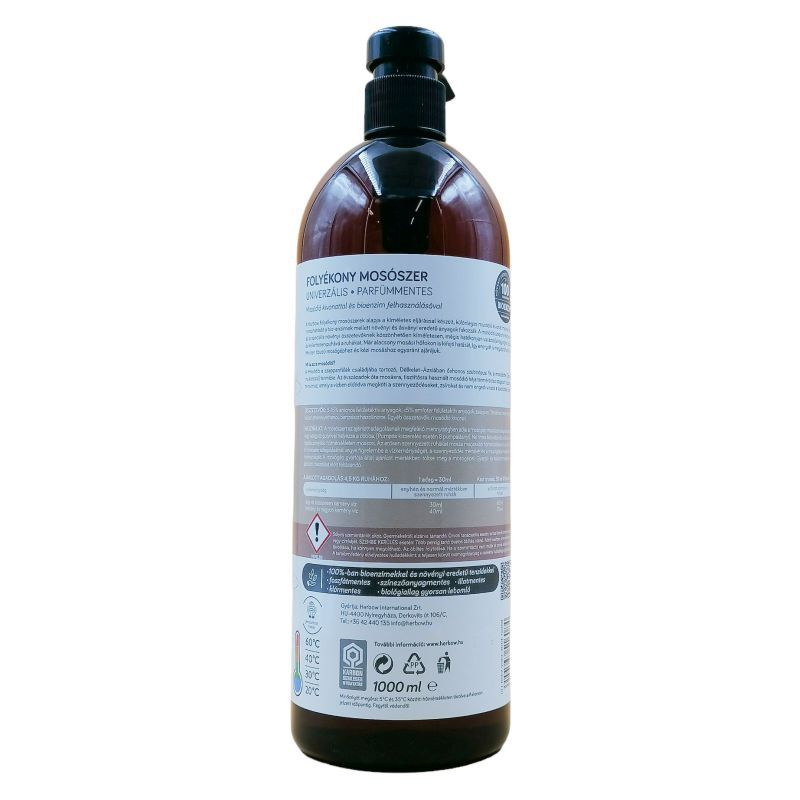 Folyékony mosószer színes ruhákhoz natúr illattal. Kimagasló mosóhatás növényi összetevőkkel, szövetkárosodás nélkül, 1000 ml-es kiszerelés: 33 mosásra elegendő. Prémium csomagolás, pumpás adagolóval. A kíméletes, de mégis hatékony növényi összetevőknek köszönhetően a pamutpólókat, ingeket és enyhén szennyezett zoknikat már 30-40 °C fokon moshatjuk.