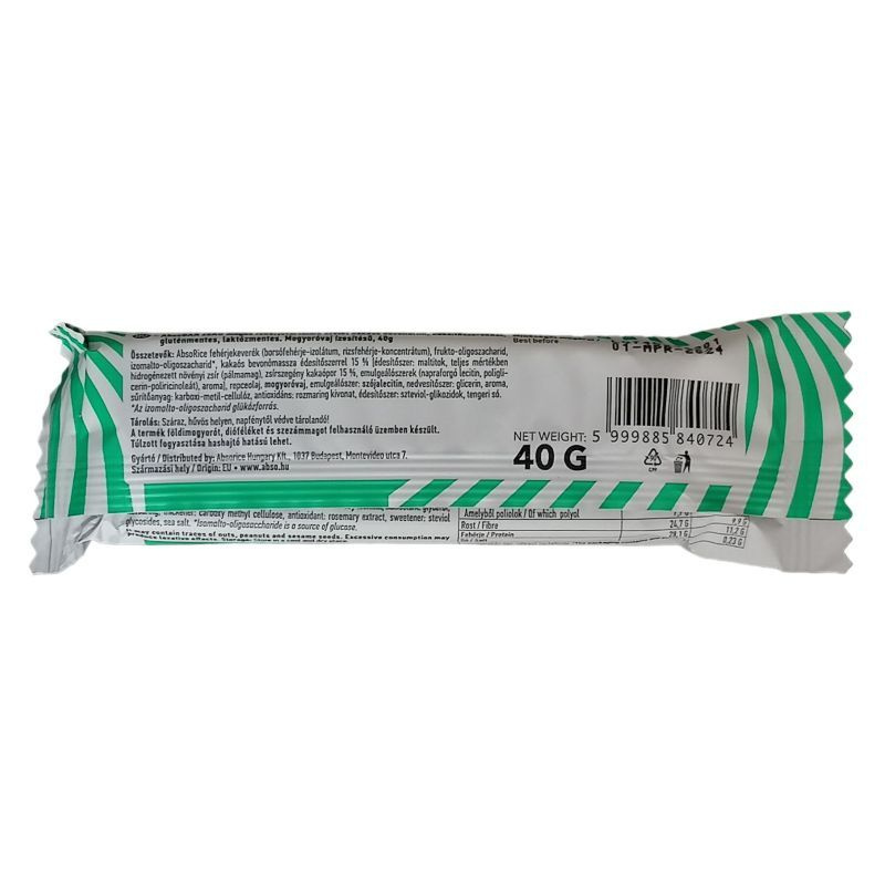 Összetevők: AbsoRice fehérjekeverék (borsófehérje-izolátum, rizsfehérje-koncentrátum), frukto-oligoszacharid, izomalto-oligoszacharid*, kakaós bevonómassza édesítőszerrel 15 % [édesítőszer: maltitok, teljes mértékben hidrogénezett növényi zsír (pálmamag), zsírszegény kakaópor 15 %, emulgeálószerek (napraforgó lecitin, poliglicerin-poliricinoleát), aroma], repceolaj, mogyoróvaj, emulgeálószer: szójalecitin, nedvesítőszer: glicerin, aroma, sűrítőanyag: karboxi-metil-cellulóz, antioxidáns: rozmaring kivonat, édesítőszer: szteviol-glikozidok, tengeri só.