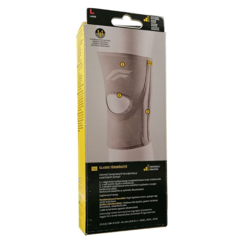 L (43,2-49,5 cm). A Classic térdrögzítő segítségével a fontos dolgokra fókuszálhat. Speciális jellemzők: Duplán rugalmas anyag az optimális illeszkedésért, nyitott térdkalács kivitelezés. Alkalmazható: Rándulás, húzódás, ízületi gyulladás, duzzanat, térdfájdalom esetén. Terméktípus: Zárt. Termékjellemzők és termékelőnyök: Tehermentesít és tartást biztosít. A kétoldalú stabilizáló különlegesen szilárdan tartja a térdet a mozgás korlátozása nélkül. Kényelmes, légáteresztő, puha anyagból. A kényelmes panelek csökkentik a térd mögötti gyűrődést. A letisztult, egyszerű design követi a térd formáját és ruha alatt sem látszik. Egyszerű felvenni és levenni. Jobb és bal térdre egyaránt alkalmazható.