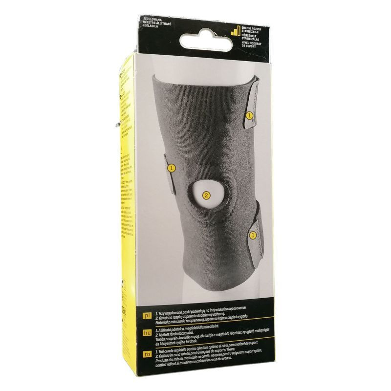 Állítható pántok a személyre szabott kényelemért és a megfelelő tartásért. Az oldalsó légáteresztő nyílások biztosítják a megfelelő szellőzést. Nyitott térdkalácsgyűrű a térdhajlat körüli gyűrődés megakadályozásáért. Könnyen le és felvehető. Jobb és bal térden egyaránt alkalmazható. Méret: 33,0-44,4 cm átmérő.