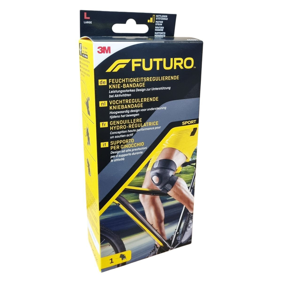 A FUTURO™ közepes tartású térdrögzítő innovatív, sportoláshoz tervezett eszköz, amely kiváló támaszt nyújt a térdízületnek. A térdrögzítő kontúrozott kialakítása és a dupla precíziós pántok optimális illeszkedést biztosítanak. Nyitott patellás kialakítása növeli a kényelmet és stabilizálja a térdkalácsot mozgás közben. Az anyag légáteresztő, így segít szabályozni a nedvességet, és ellenáll a kellemetlen szagoknak, miközben megnyugtató meleg érzetet is biztosít. A termék univerzálisan használható jobb és bal térden, és ajánlott többféle sporttevékenységhez, például kerékpározáshoz, teniszezéshez és általános edzéshez. Használatakor ügyelni kell az esetleges neoprén-érzékenységre, és bőrreakció esetén a használatot abba kell hagyni és orvosi segítséget kérni. Mosása 30°C-on történik, kímélő módon, tisztítása nem lehetséges vegytisztítással, nem vasalható, nem szárítható gépben, és nem fehéríthető.