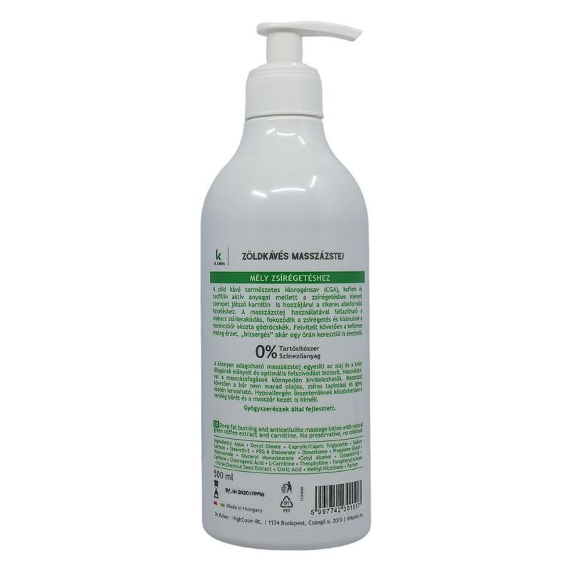 Forradalmi újdonság mély zsírégetéshez. A Zöld kávé természetes klorogénsav (CGA), koffein és teofillin hatóanyagai mellett a zsírégetésben kiemelt szerepet játszó carnitin elementáris ereje is hozzájárul a sikeres kezeléshez. Herbal-System koncepció alapján kifejlesztett masszázstej használatával fellazítható a makacs zsírlerakódás, fokozódik a zsírégetés és kisimulnak a narancsbőr okozta gödröcskék. Felvitelt követően a kellemes meleg érzet, "bizsergés" akár egy órán keresztül is érezhető.
