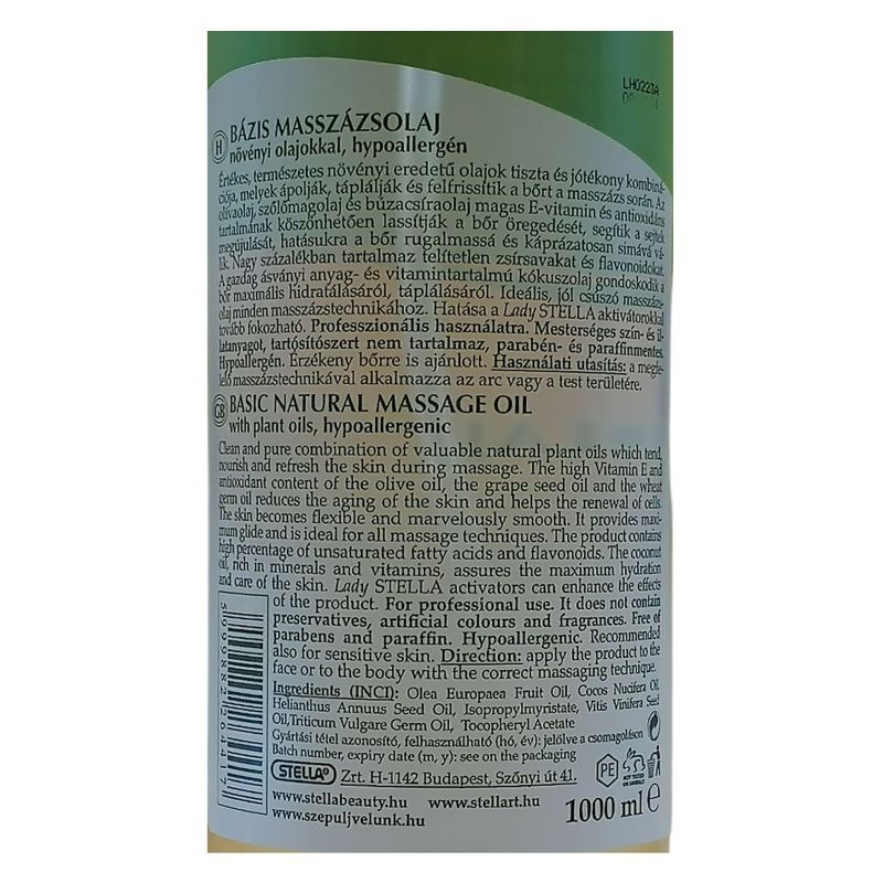 Megfelelően kiválasztott aktivátor (növényi illóolaj) vagy ampulla adagolásával kiválóan alkalmas kozmetikai (arc és dekoltázs) masszázshoz, alakformáló masszázshoz, frissítő testmasszázshoz, sport-, és gyógymasszázshoz egyaránt. Hatása a Lady Stella aktivátorokkal tovább fokozható. Mesterséges szín- és illatanyagot, tartósítószert nem tartalmaz, parabén- és paraffinmentes. Hypoallergén. Használati tanács: Használatát javasoljuk kézi és gépi masszázshoz. A szükséges mennyiségű olajjal végezzük az alkalmazott masszázstechnikát.