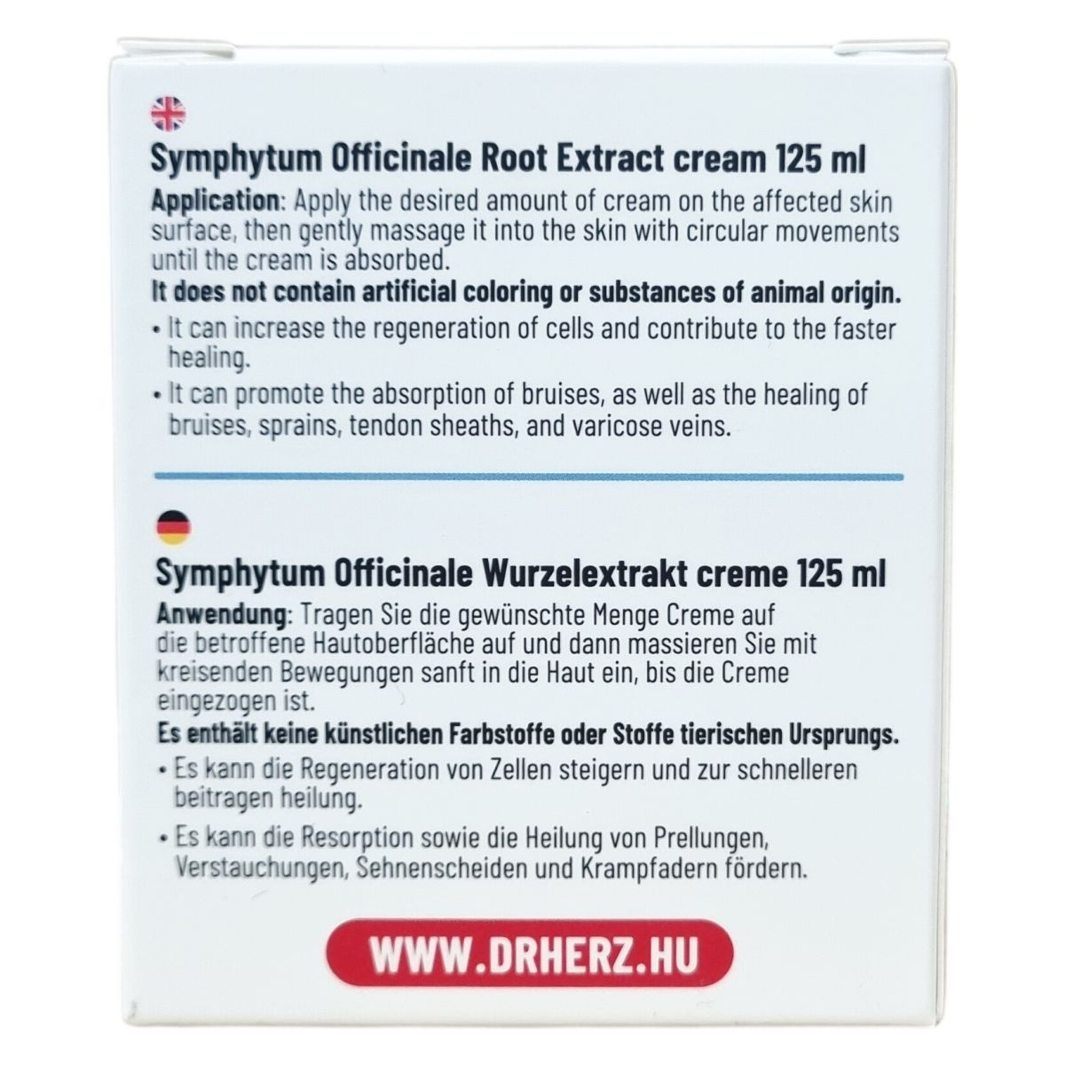 A Dr.Herz fekete nadálytő krém természetes összetevőkkel készült, mesterséges színezékektől és állati eredetű alapanyagoktól mentes készítmény. Német minőségben gyártott termék, mely hozzájárulhat a sejtek gyorsabb regenerálódásához, segíthet a véraláfutások felszívódásában, valamint támogatja a zúzódások, rándulások, ínhüvely-gyulladások és visszerek gyógyulását. Különösen ajánlott sérült vagy fájdalmas bőrfelületek ápolására. A krém használata során a bőrbe masszírozott hatóanyagok segítik a gyógyulási folyamatokat, miközben nem tartalmaz mesterséges színezékeket vagy állati eredetű anyagokat, így megfelel a természetes kozmetikumok iránti igényeknek. A termék elérhető gyógyszertárakban és gyógynövényboltokban, ahol más természetes hatóanyagú termékek, illóolajok, vitaminok és étrend-kiegészítők is kaphatók.
