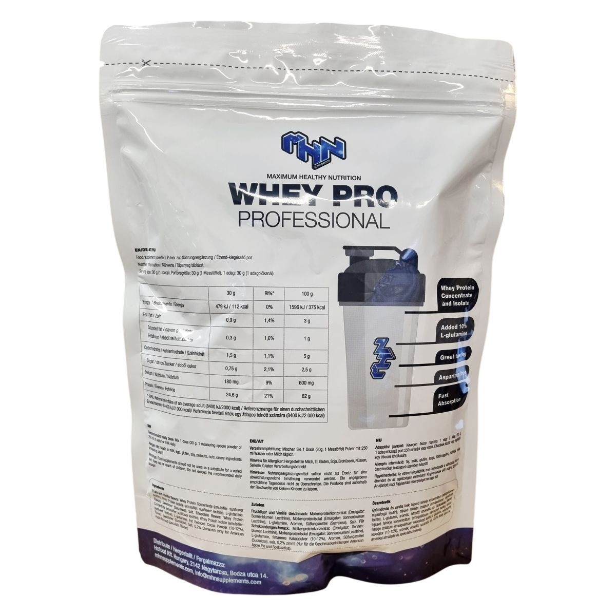 A MHN WHEY PRO PROFESSIONAL egy professzionális minőségű tejfehérje por, amely koncentrátum és izolátum formában tartalmazza a fehérjét, kiegészítve 10% L-glutaminnal. Az aszpartámmentes termék alacsony zsírtartalmú és hozzáadott cukrot nem tartalmaz. Az ital gyorsan oldódik, így kényelmesen készíthető el vízzel vagy tejjel. A termék fogyasztása étkezések között, illetve egy étkezés kiváltására is javasolt lehet. A készítmény allergén feldolgozó üzemekben készült, ahol tej, tojás, glutén, szója, földimogyoró, diófélék és zeller is jelen van, ezért az allergiások körültekintően használják. A csomag 33 adag port tartalmaz, 30 g-os adagolással.