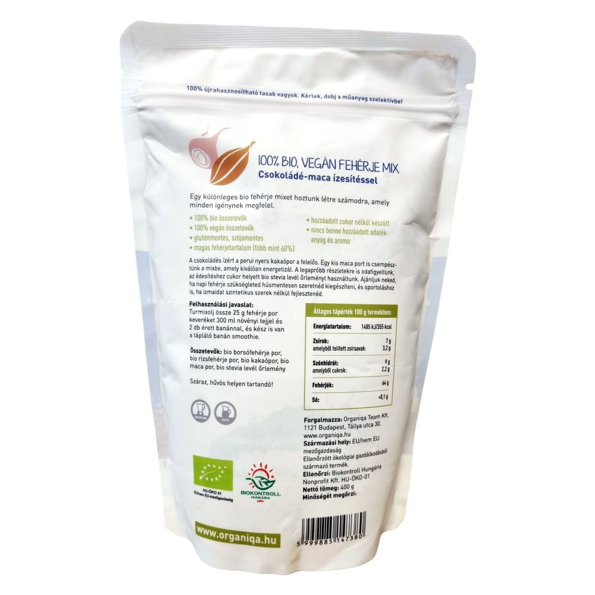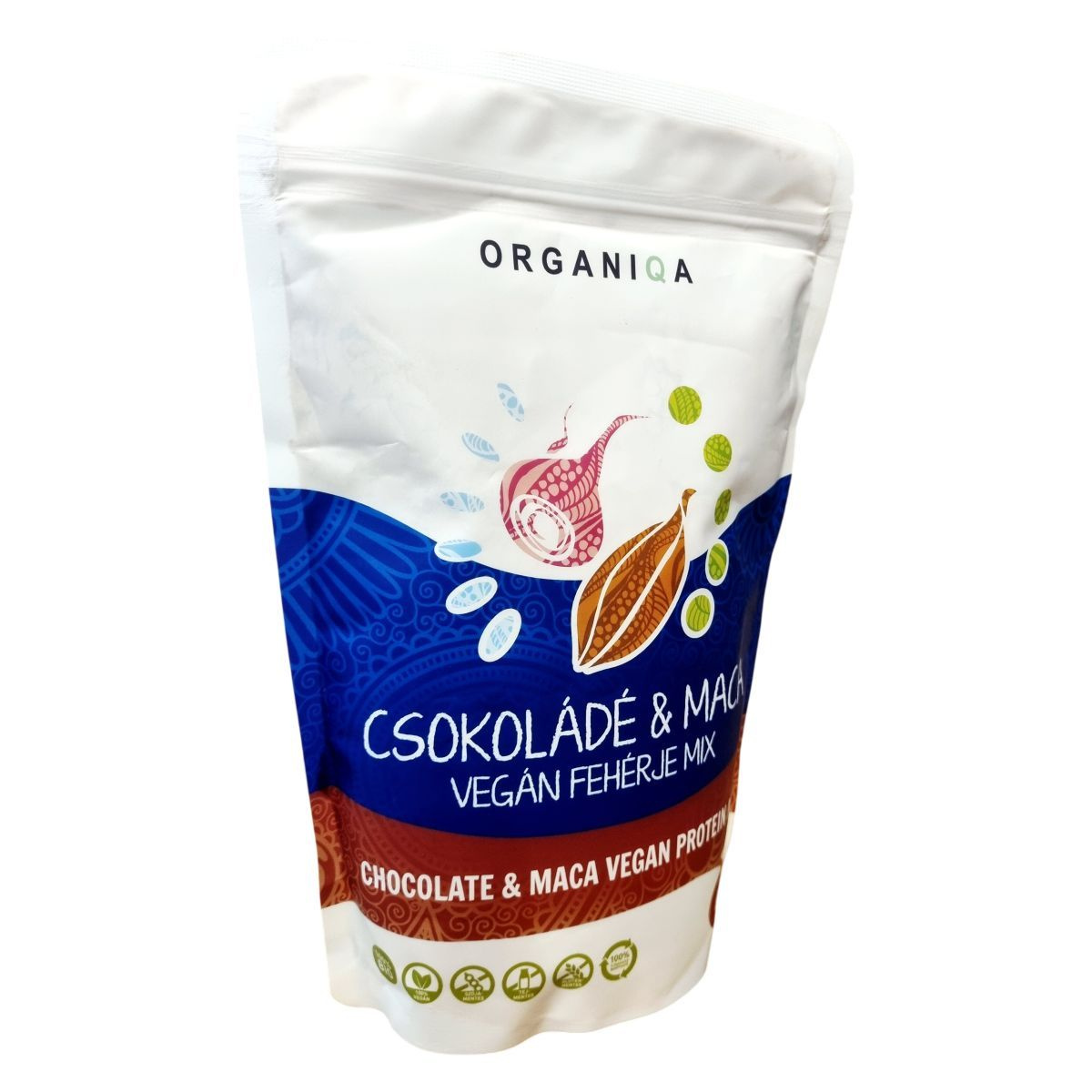 Az Organiqa Csokoládé & Maca Vegán Fehérje Mix egy 100% bio és vegán fehérje keverék, amely csokoládé-maca ízesítéssel készült. A termék különlegessége, hogy perui nyers kakaóporral és maca porral gazdagították, amelyek hozzájárulhatnak az energiaszint növeléséhez. Az édesítéshez bio stevia levél őrleményt használtak, így a termék hozzáadott cukor és adalékanyagok nélkül készült. A fehérje mix ideális lehet azok számára, akik húsmentesen szeretnék kiegészíteni napi fehérjebevitelüket, és sportoláshoz is ajánlott, ha izmaikat szintetikus szerek nélkül szeretnék fejleszteni. A termék 100% újrahasznosítható tasakban érkezik, amelyet a műanyag szelektív hulladékgyűjtőbe lehet dobni.