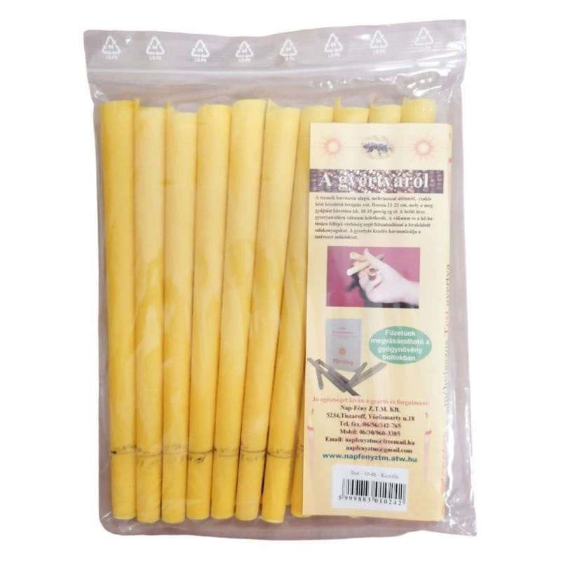 Hossza 21-22 cm, mely a meggyújtást követően kb. 10 -15 percig ég el. A belül üres gyertyatestben vákuum keletkezik. A vákuum és a hő hatására fellépő vérbőség segít felszabadítani a lerakódott salakanyagokat. Összetétel: lenvászon 100% natúr, méhviasz 70-74%, é.p.paraffin 26-30%, illóolaj. Csomagolás: nylon tasak,gézlap Közvetlen hőtől és fénytől védve tárolandó. Minőségét korlátlan ideig megőrzi. Gyerekek elől tartsa elzárva. Mivel a gyertya nyílt lánggal ég a tűzvédelmi szabályokat mindenképp tartsa be! A gyertyázás nem helyettesíti az orvosi kezelést, szaktanácsadást!