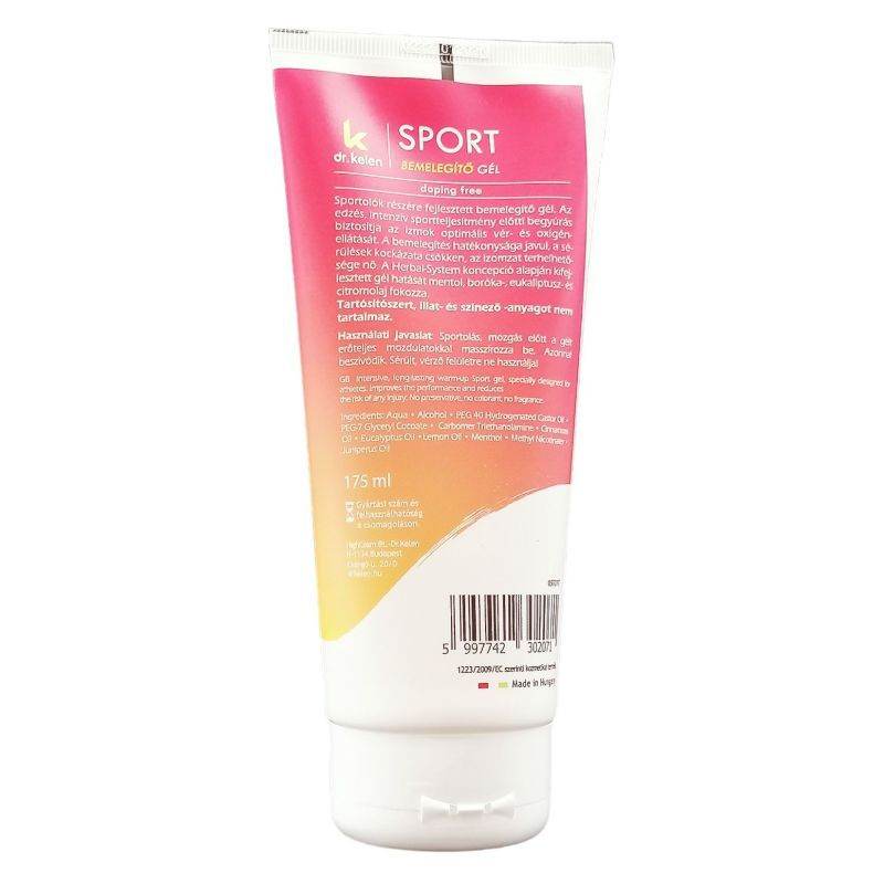 Megfelelően végzett bemelegítéssel, begyúrással a sérülések kockázata, a túlterhelés veszélye csökkenthető, a teljesítményed javítható. A fokozott terhelésnek kitett testrész erőteljes bedörzsölése, átmozgatása elősegíti, hogy az izmok optimális állapotba kerüljenek, vér- és oxigénellátásuk javuljon. A természetes gyógynövényi hatóanyagokban gazdag, kerisgésfokozó bemelegítő gél használatával a bemelegítési idő lerövidíthető. Csípős, kellemes melegérzet, esetenként bőrpír jelzi a gél lokális keringésfokozó hatását. A készítmény gyorsan beszívódik, de hatása hosszan érezhető. Nem hagy foltot a ruhán, a bőr nem ragad. Aktív anyagok: boróka, citrom olaj, fahéj, mentol, eukaliptus.