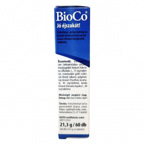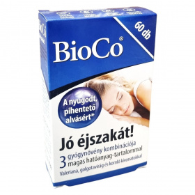 A BioCo Jó éjszakát! étrend-kiegészítő tabletta három gyógynövény kivonatát magas hatóanyag-tartalommal egyesíti: macskagyökér (Valeriana officinalis L.), golgotavirág (Passiflora incarnata) és komló (Humulus lupulus L.). A termék kis méretű, könnyen nyelhető, 9 mm átmérőjű tablettákból áll, amelyek kettős adagja megfelel 1500 mg Valeriana, 800 mg golgotavirág és 800 mg komló száraz növényi őrleménynek. A macskagyökér hozzájárulhat a pihentető, nyugodt alváshoz és a normál idegállapot fenntartásához stresszes vagy túlterhelt életmód esetén. A komló és golgotavirág elősegítheti az egészséges alvást, a relaxációt és a lelki egyensúly megtartását. A termék magyar fejlesztésű és gyártású, a hatóanyagok ugyan nem Magyarországról származnak, azonban a gyártás és fejlesztés kizárólag Magyarországon történik. A BioCo Magyarország Kft. ISO 22000 szabvány és Jó Gyártási Gyakorlat (GMP) irányelvek szerint tanúsított élelmiszerbiztonsági rendszert működtet. A terméket vegán, laktózmentes, gluténmentes és színezékmentes változatban kínálják.