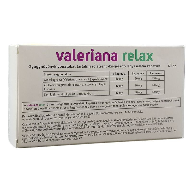 A Valeriana Relax kapszula olyan gyógynövények kivonatát tartalmazza, amelyek hatóanyagai hozzájárulhatnak a normál idegállapot és a lelki egyensúly fenntartásához, valamint a pihentető alváshoz. Hatóanyag napi 1 kapszulában: macskagyökér gyökér kivonat: 60mg, golgotavirág virágos hajtás kivonata: 40 mg, komló toboz kivonat: 40 mg.