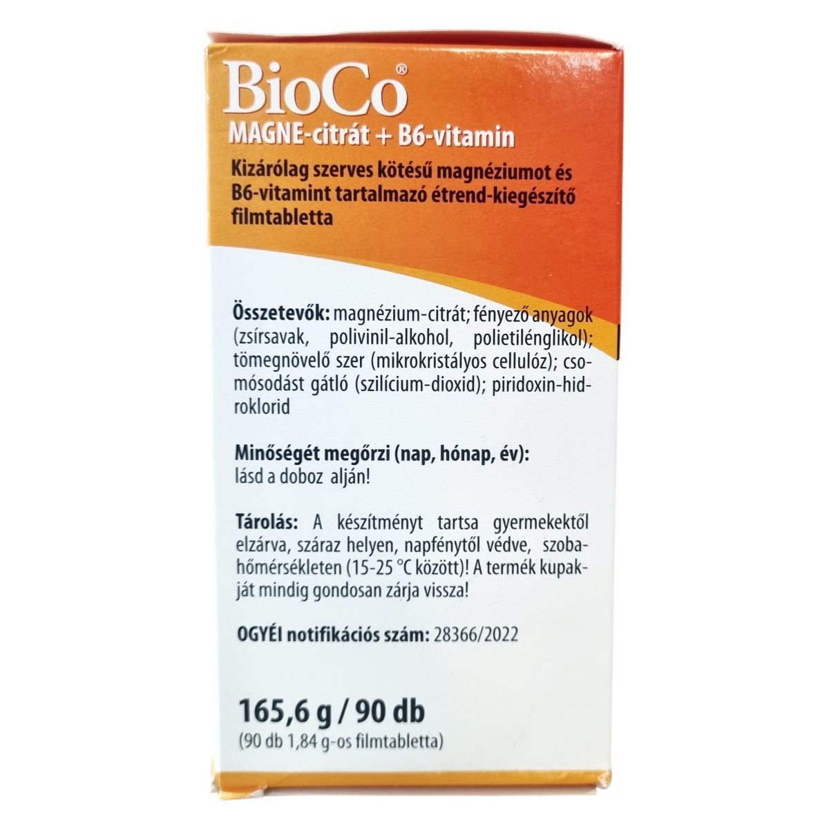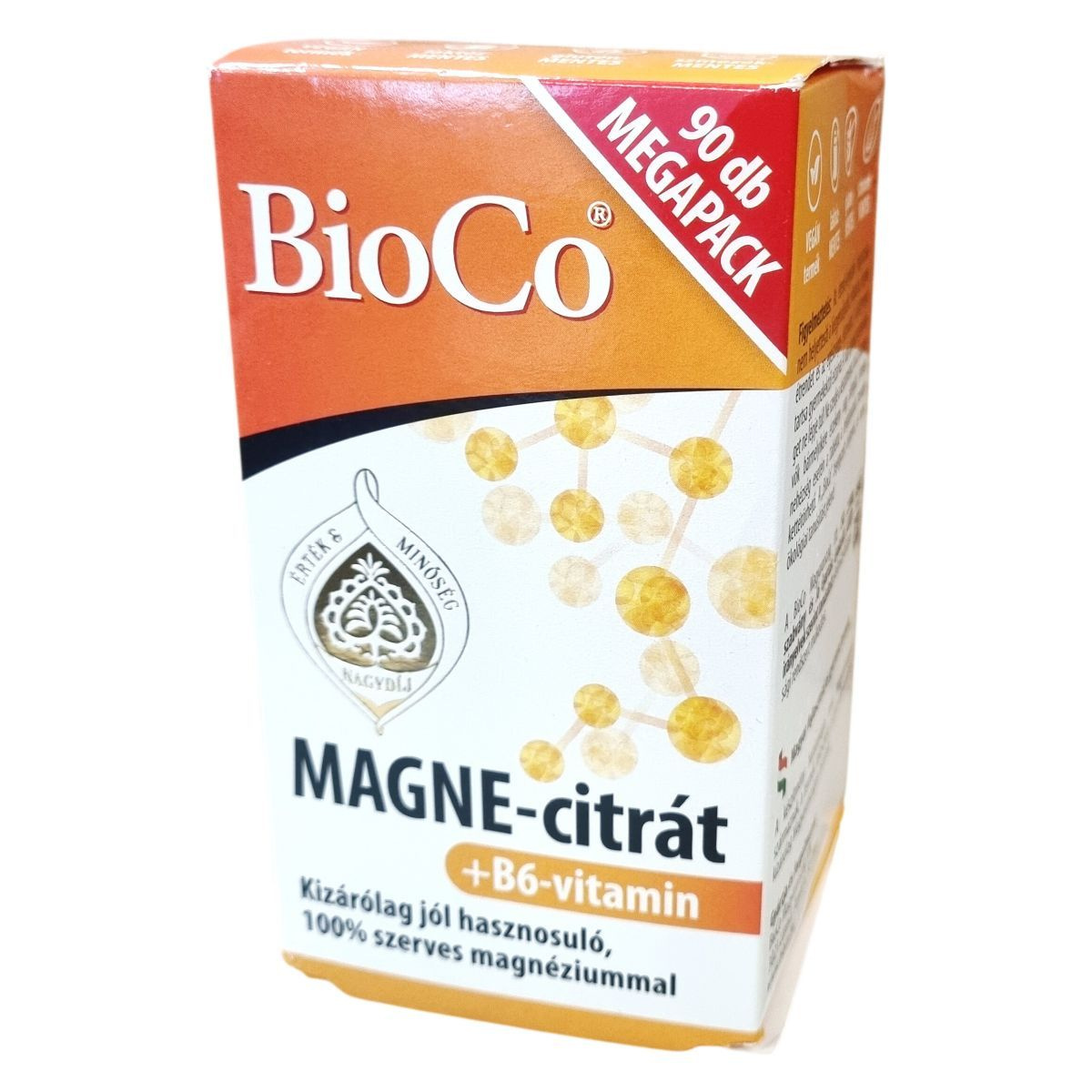 A BioCo MAGNE-citrát + B6-vitamin kizárólag szerves kötésű magnéziumot és B6-vitamint tartalmazó étrend-kiegészítő filmtabletta. A magnézium jól hasznosuló formában van jelen a termékben, kizárva a szervetlen magnézium vegyületeket, mint a magnézium-karbonát vagy magnézium-oxid. A B6-vitamin a magnézium hatását kiegészíti azzal, hogy hozzájárulhat az ideg- és immunrendszer normál működéséhez, a hormonális aktivitás szabályozásához, a normál vörösvérsejt-képződéshez, valamint a fáradtság és kifáradás csökkentéséhez. A termék vegán és nem tartalmaz laktózt, glutént vagy színezékeket. Magyar fejlesztésű és gyártású, amelynek hatóanyagai nem Magyarországról származnak. Az új, színezékmentes nyeléskönnyítő bevonat segítheti a tabletta könnyebb lenyelését. A termék 90 darab, egyenként 1,84 g-os filmtablettát tartalmaz, összes tömege 165,6 g. A „BioCo” bejegyzett cégnevet jelöl, nem ökológiai tanúsítást. Az ISO 22000 és GMP előírásoknak megfelelően gyártott termék magas minőségi és élelmiszerbiztonsági színvonalat képvisel.