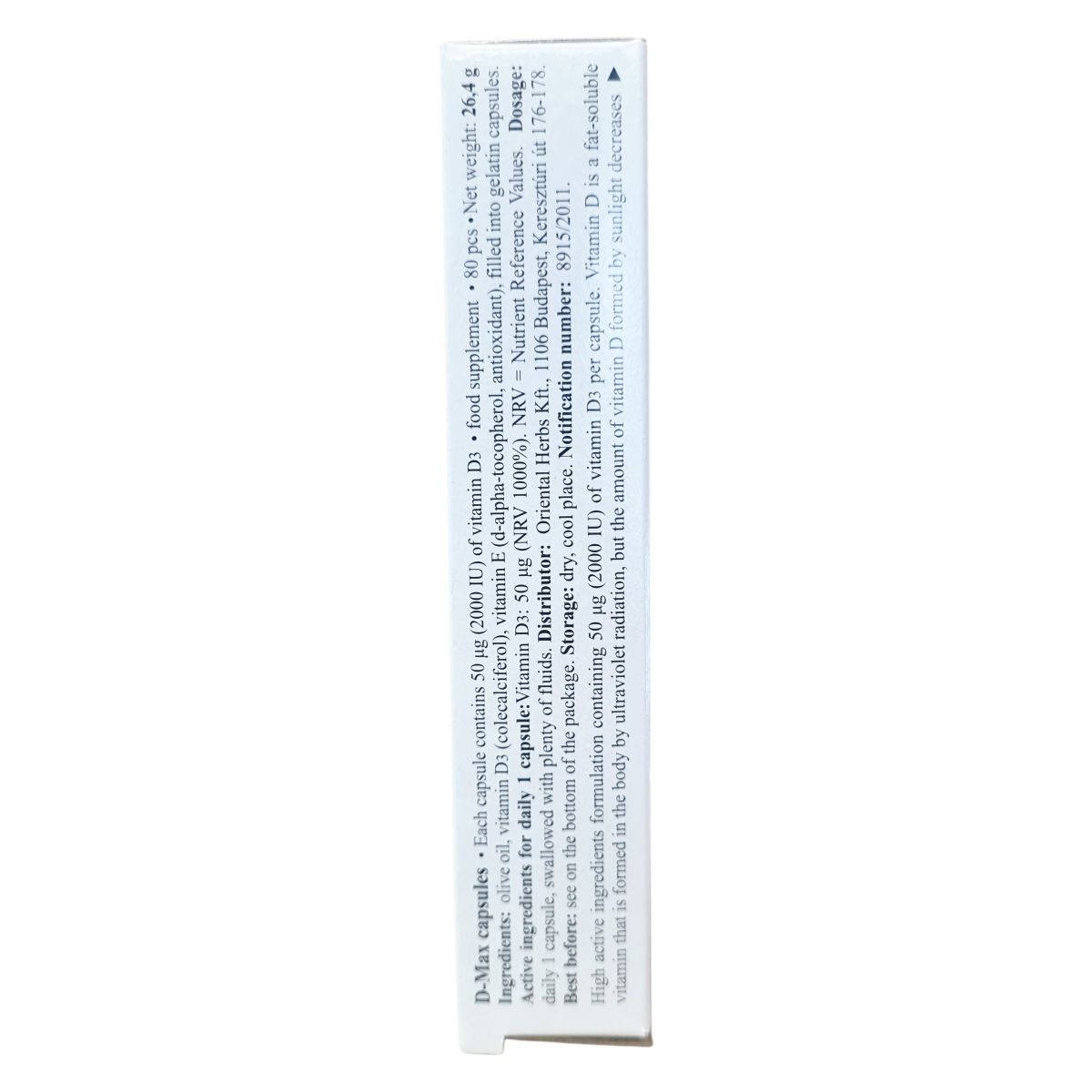 A D-Max kapszula magas hatóanyagtartalmú készítmény, mely kapszulánként 50 µg (2000 NE) D3-vitamint tartalmaz. A D-vitamin zsírban oldódó vitamin, amely ultraibolya sugárzás hatására keletkezik a szervezetben, azonban a napfény hatására képződő mennyiség az életkor előrehaladtával jelentősen csökkenhet. Tekintettel a Magyarországon mért napos órák számára és a napon eltöltött időre, sok esetben szükségessé válhat a D3-vitamin pótlása minden korosztály számára az étrenddel. A D-vitamin hozzájárulhat az immunrendszer működéséhez, támogathatja az egészséges csontok és fogak megőrzését, részt vehet a kalcium és foszfor felszívódásában és hasznosulásában, segítheti a normál izomfunkció fenntartását, hozzájárulhat a normál vér kalciumszintjének fenntartásához, valamint szerepet játszhat a sejtosztódásban.