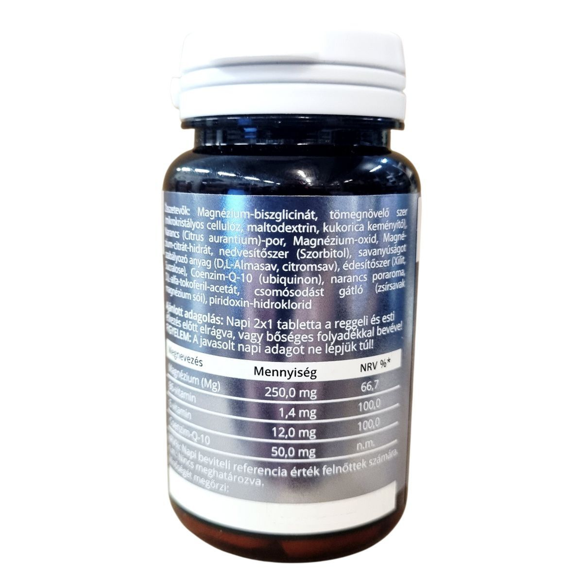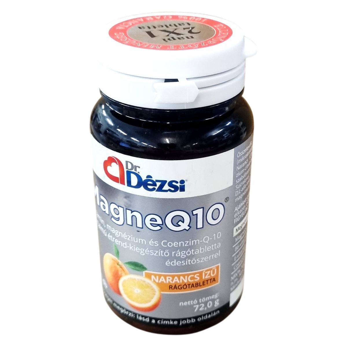 Narancs ízű rágótabletta magnéziummal, B6-vitaminnal, E-vitaminnal és koenzim-Q-10-zel, édesítőszerrel készült étrend-kiegészítő.