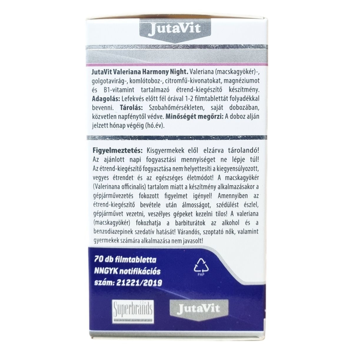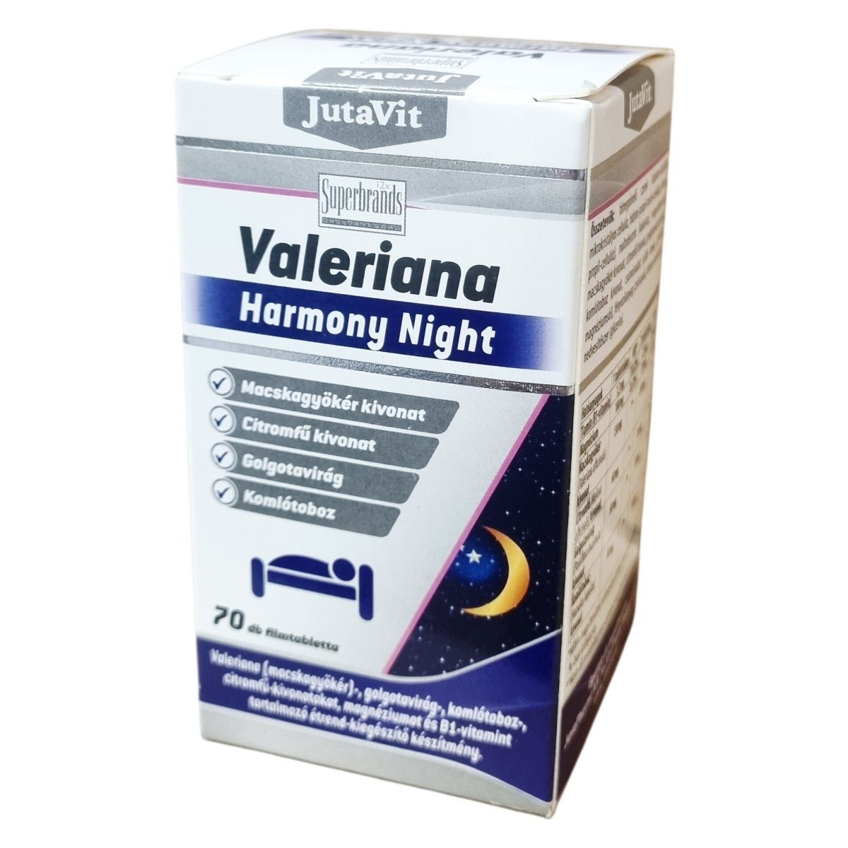 A JutaVit Valeriana Harmony Night egy étrend-kiegészítő készítmény, amely macskagyökér-, golgotavirág-, komlótoboz- és citromfű-kivonatokat, valamint magnéziumot és B1-vitamint tartalmaz. A termék filmtabletta formában, 70 darab kiszerelésben érhető el. A készítmény használatakor ajánlott a lefekvés előtti időszakban 1-2 filmtablettát folyadékkal bevenni. A komponensek megválasztása révén a termék hozzájárulhat a relaxációhoz és a nyugodt éjszakai pihenés támogatásához. A macskagyökér tartalma miatt a használat során fokozott figyelem ajánlott a gépjárművezetés és veszélyes gépek kezelése terén. A készítmény nem helyettesíti a kiegyensúlyozott étrendet és az egészséges életmódot, gyermekek, várandós és szoptató nők számára történő alkalmazása nem javasolt.