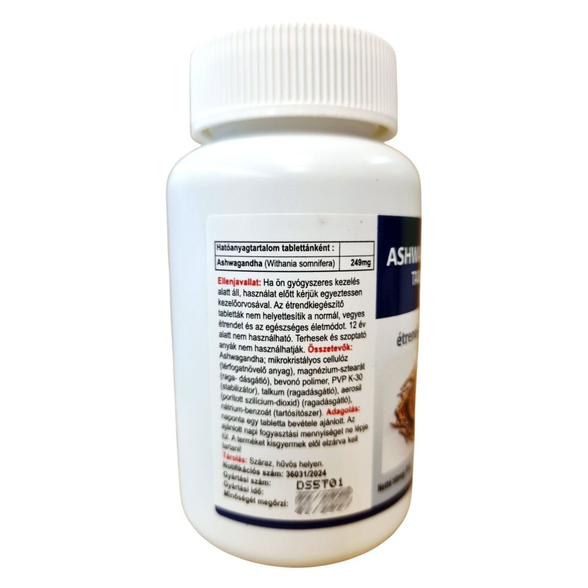 Ashwagandha; mikrokristályos cellulóz (térfogatnövelő anyag); magnézium-sztearát (csomósodásgátló); bevonó polimer PVP K-30 (stabilizátor); talkum (ragadásgátló); aerosil (porított szilícium-dioxid, ragadásgátló); nátrium-benzoát (tartósítószer).