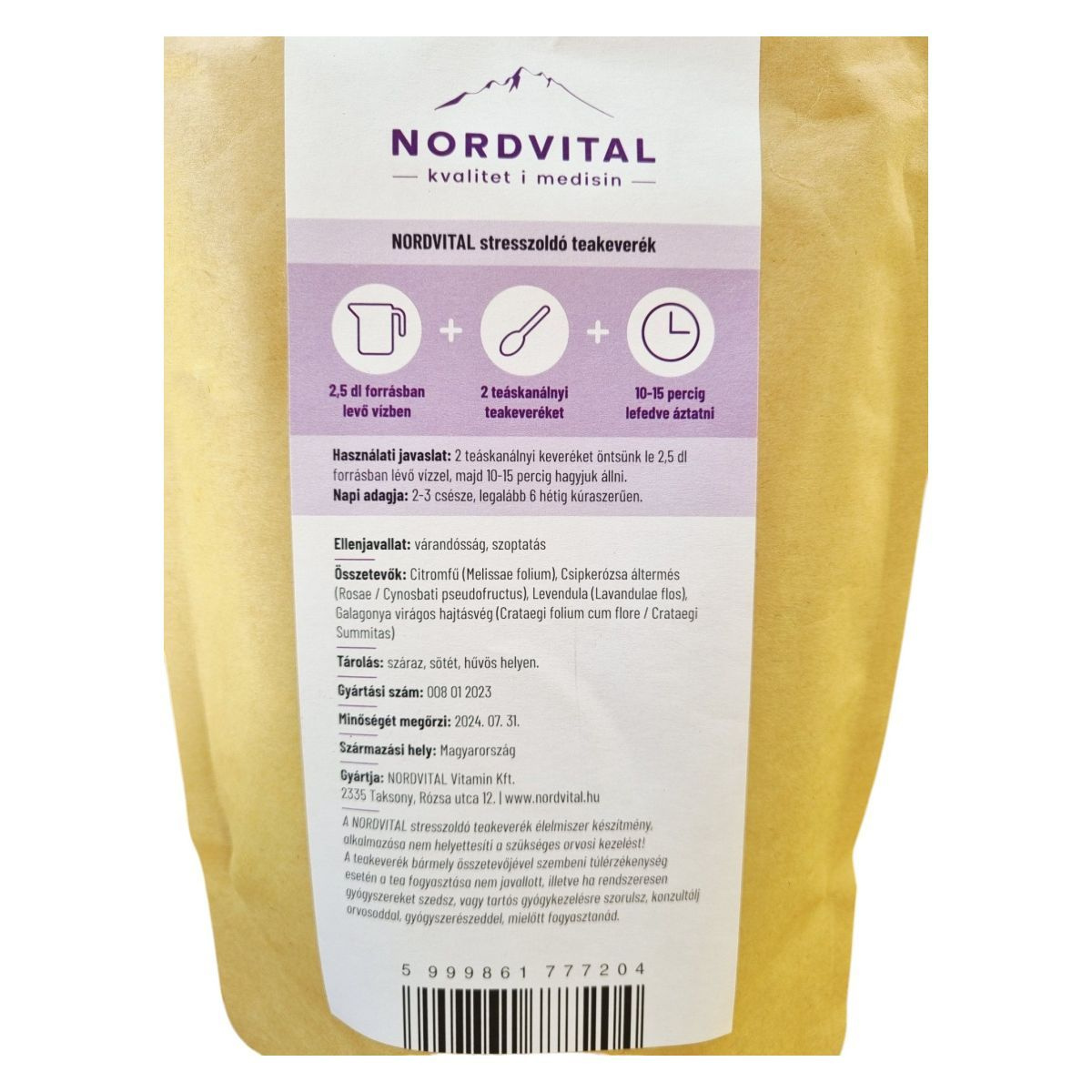 A NORDVITAL Keep Calm stresszoldó teakeverék egy 100% natúr gyógynövényekből készült termék, amely segíthet a stressz csökkentésében. A citromfű, csipkerózsa, levendula és galagonya virágos hajtásvég kombinációja hozzájárulhat a nyugalom megőrzéséhez. A teakeverék alkalmazása nem helyettesíti a szükséges orvosi kezelést. A termék fogyasztása nem javasolt várandósság és szoptatás idején, valamint túlérzékenység esetén. A teát száraz, sötét, hűvös helyen tároljuk.