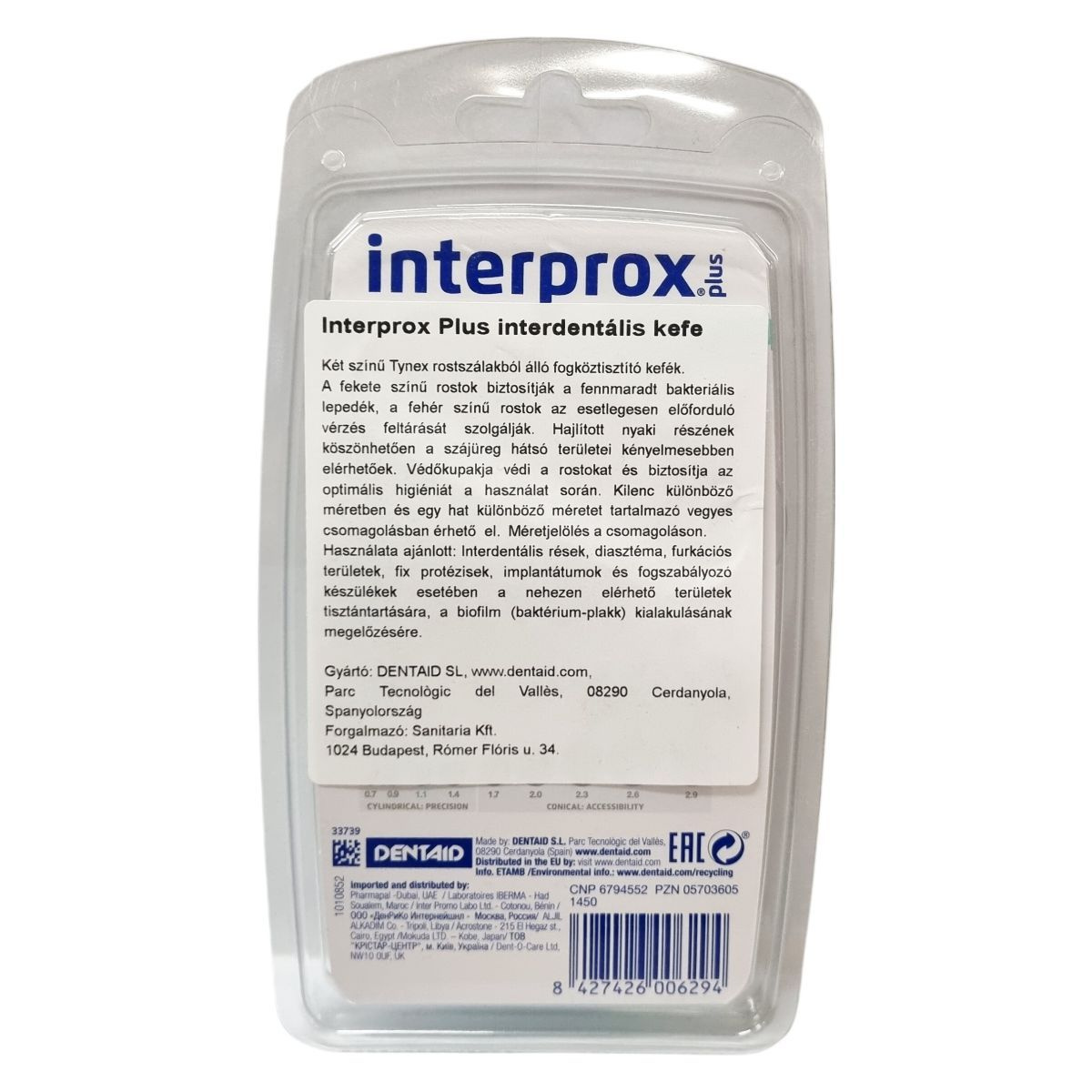 Az Interprox Plus fogköztisztító kefe fekete és fehér színű Tynex rostszálakból áll, melyek külön funkcióval bírnak: a fekete rostok a fennmaradt bakteriális lepedék eltávolítását, míg a fehérek a vérzés feltárását segítik elő. A hajlított nyaki rész megkönnyíti a hátsó szájüreg elérését, míg a védőkupak védi a rostokat és biztosítja a higiénikus használatot. Kilenc különböző méretben, valamint egy vegyes, hat méretet tartalmazó csomagban érhető el. A méretjelölés megtalálható a csomagoláson. A termék célja a biofilm kialakulásának megelőzése és a szájhigiénia fenntartása a nehezen hozzáférhető helyeken, különösen protézisek, implantátumok és fogszabályozók mellett.