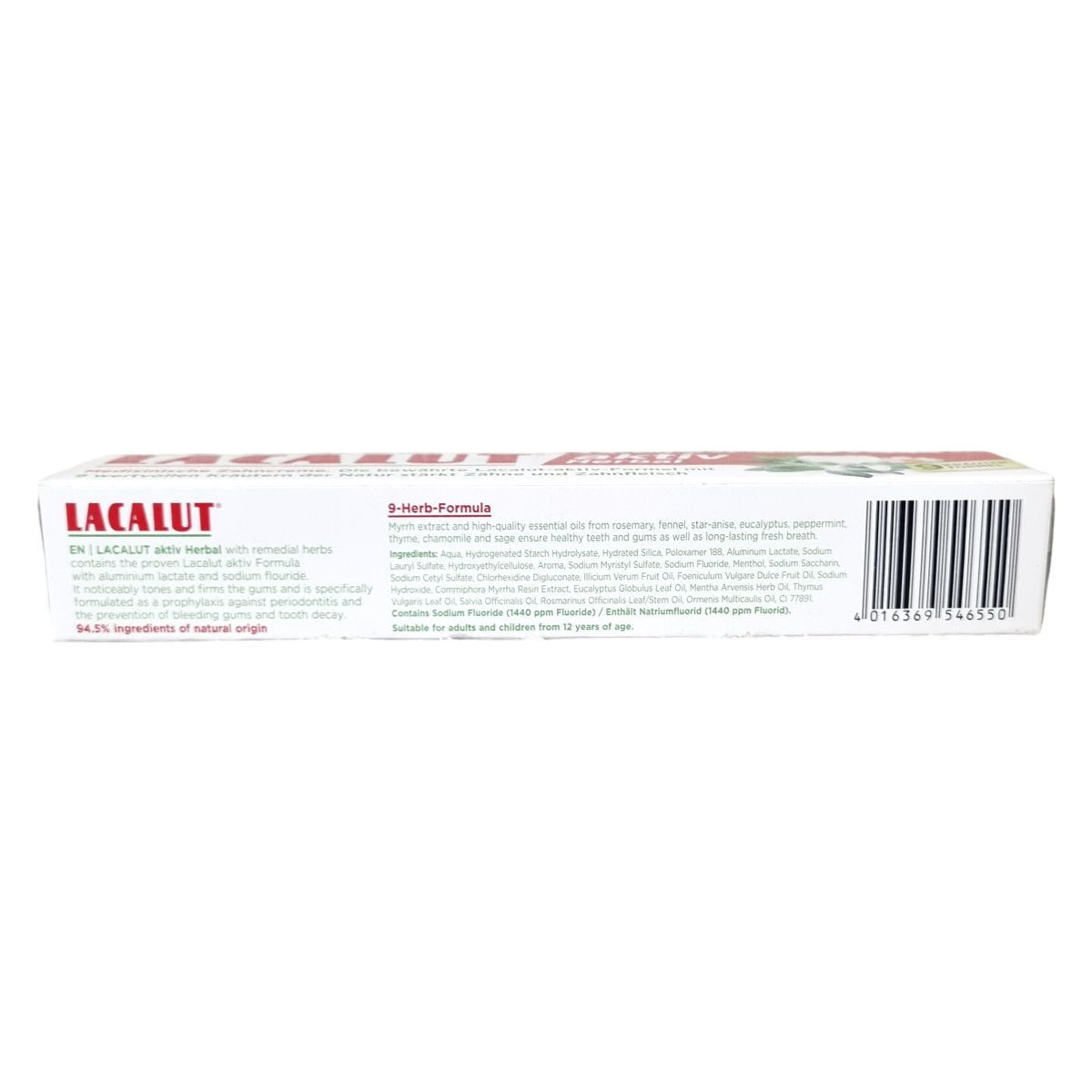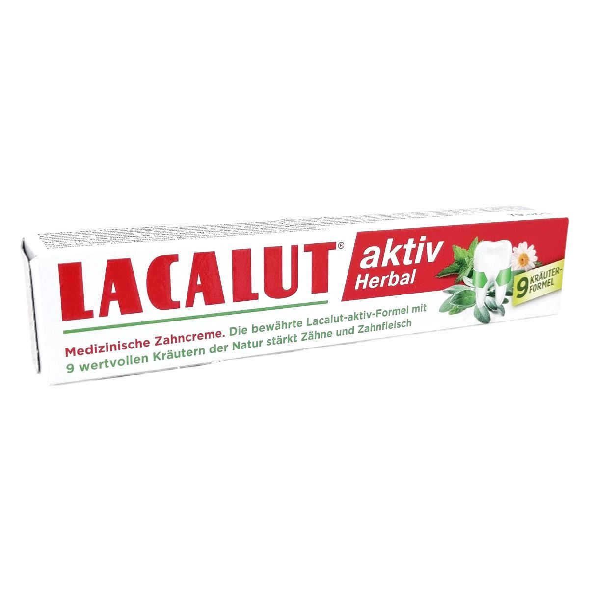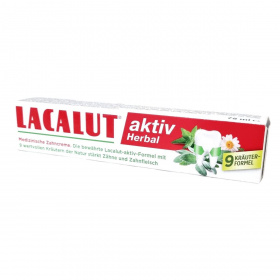 A Lacalut aktiv Herbal fogkrém a jól bevált Lacalut aktiv formulát és kilenc értékes gyógynövényt kombinál, melyek természetes eredetű összetevők 94,5%-át teszik ki. A termék értékes gyógynövényekkel, mint a mirha-kivonat és rozmaring, édeskömény, csillagánizs, eukaliptusz, borsmenta, kakukkfű, kamilla és zsálya illóolajai gondoskodik a fogak és a fogíny egészségéről, valamint hosszan tartó friss leheletet biztosít. Speciálisan fogágybetegségek megelőzésére, fogínyvérzés és fogszuvasodás elleni védelemre fejlesztették ki. A termék alumínium-laktáttal és nátrium-fluoriddal van gazdagítva, így hatékonyan erősíti a fogakat és feszesíti a fogínyt. Csak felnőttek és 12 év feletti gyermekek részére ajánlott használatra.