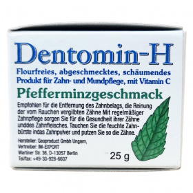 A Dentomin-H menta ízesítésű, fluort nem tartalmazó ásványi fogpor, amely rendszeres használattal támogatja a fogak és az íny egészségét. Különösen ajánlott a dohányzás miatt elszíneződött fogak tisztítására és a fogkő eltávolítására. A termék habzó, így alapos tisztítást biztosít. Tartalmaz továbbá C vitamint, amely hozzájárulhat a szájüreg egészségéhez. A fogmosás során a nedves fogkefét a porba mártva használjuk, majd a száj alapos öblítésével zárjuk a folyamatot. A csomagolás 25 gramm fogport tartalmaz.
