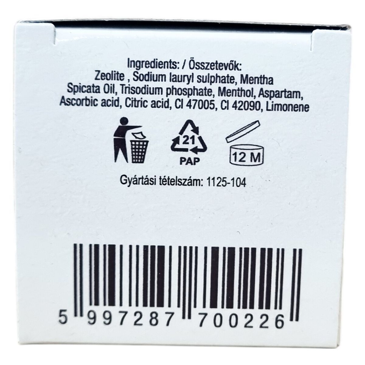 Zeolit, Nátrium-lauril-szulfát, Mentha Spicata Oil, Trinátrium-foszfát, Mentol, Aszpartám, Aszkorbinsav, Citromsav, Cl 47005, Cl 42090, Limonén