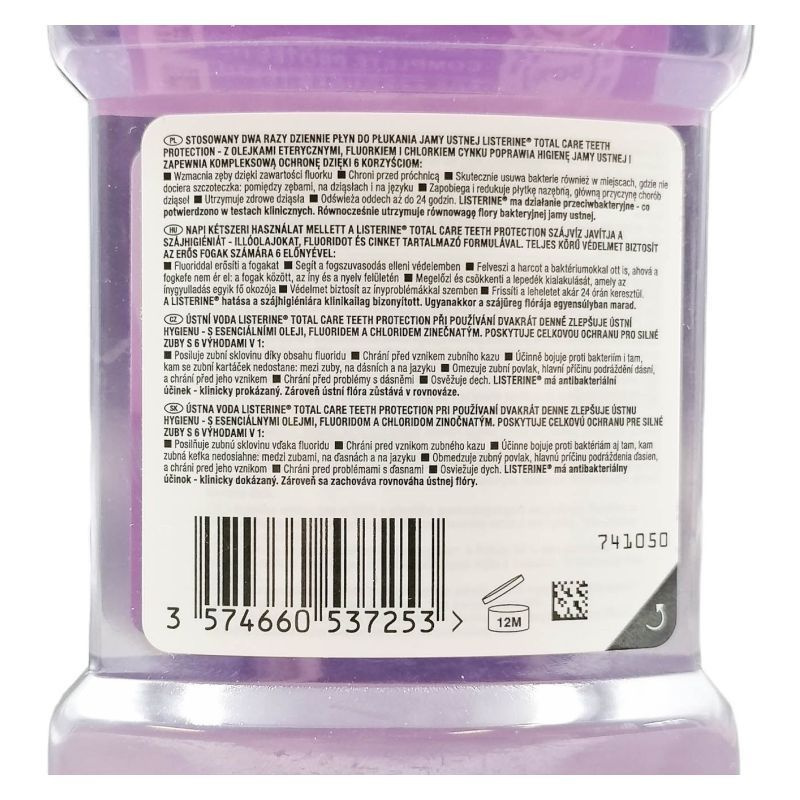 Elpusztítja a szájban lévő baktériumokat. Csökkenti a plakk kialakulását. Segít megőrizni az egészséges fogínyt. Erősítve a fogakat véd a fogszuvasodás ellen. Megelőzi a fogkő kialakulását, így segít megőrizni fogai természetes fehérségét. Napi kétszeri használat hosszantartó friss leheletet biztosít. A Listerine Total Care antibakteriális szájvíz illóolaj összetevőket tartalmaz: eukaliptol, timol, mentol és metil szalicilát.