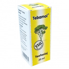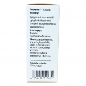 A Tebamol® teafaolaj gyógyszernek nem minősülő, gyógyhatású készítmény, melynek hatását szakirodalmi adatok igazolják. Külsőleg alkalmazandó, különféle bőrfertőzések és gyulladások enyhítésére, beleértve a száj- és fogínygyulladást, valamint vágott vagy horzsolt sebeket. Alkalmazása előtt mindig hígítani kell, és ügyelni kell, hogy ne kerüljön szem vagy annak környékére. A termék 20 ml-es kiszerelésben kapható, és felbontás után 3 hónapon belül javasolt felhasználni. Tárolása 25°C alatt ajánlott.