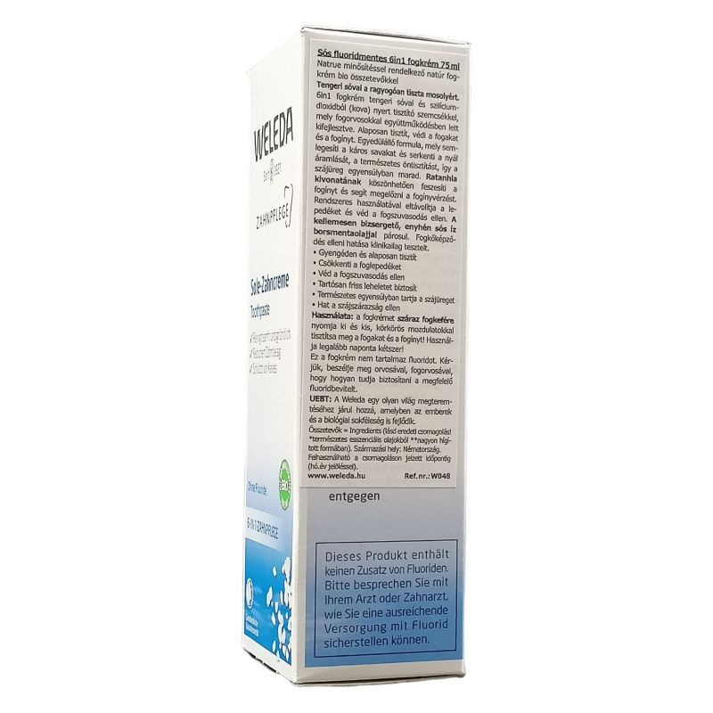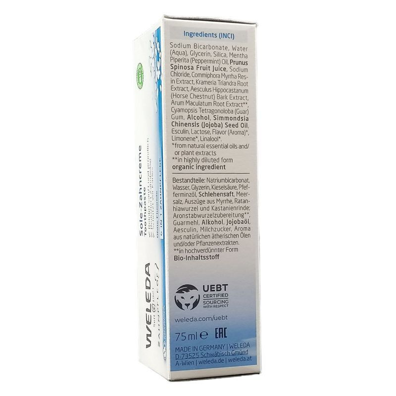 A tengeri só tartalmú fogkrém természetes szódabikarbónát is tartalmaz, mely a fogkő kialakulását megakadályozza, ezen felül pedig semlegesíti a káros savakat is. A Weleda fogápoló szerekben gyakran alkalmazott kivonat a ratanhia-gyökér, mely megelőzi a fogínysorvadást. A mirrha, gesztenye és Aesculin növényi kivonata erősítik a fogínyt és megelőzik a fogszuvasodást. A tengeri só jellegzetes ízét a borsmenta természetes illóolajával kombináltuk. Ötlet: a Sós fogkrémmel jobb hatást érhetünk el, ha száraz fogkefére tesszük. A fokozott nyáltermelődésnek köszönhetően mindig elegendő mennyiségű folyadék keletkezik.