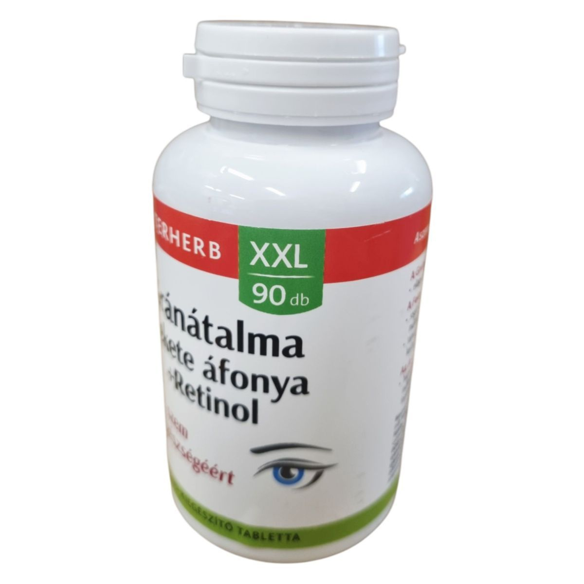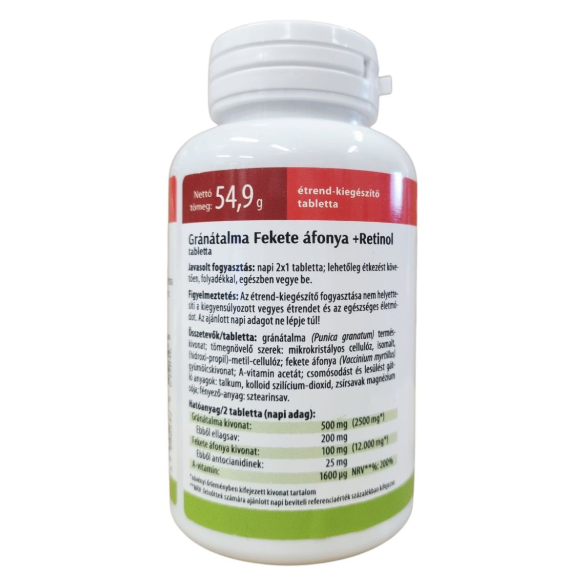 Az INTERHERB Gránátalma Fekete áfonya +Retinol étrend-kiegészítő tabletta a szem egészségének támogatására készült. A gránátalma ellagsavban gazdag, míg a fekete áfonya segítheti a szem vérkeringésének fenntartását és a retina működését. Az A-vitamin hozzájárulhat a normál látás fenntartásához és az immunrendszer normál működéséhez. A termék minőségét a csomagoláson jelzett ideig őrzi meg, és szobahőmérsékleten tárolandó. A termék forgalmazója az Interherb Kft., amelynek székhelye Budapest, Tátra u. 25.