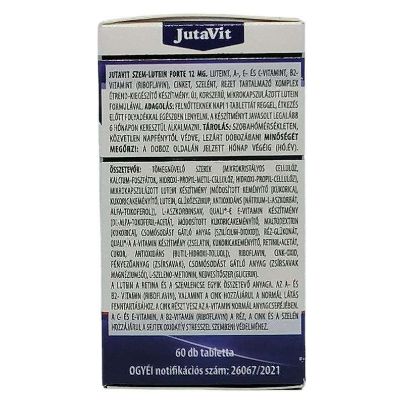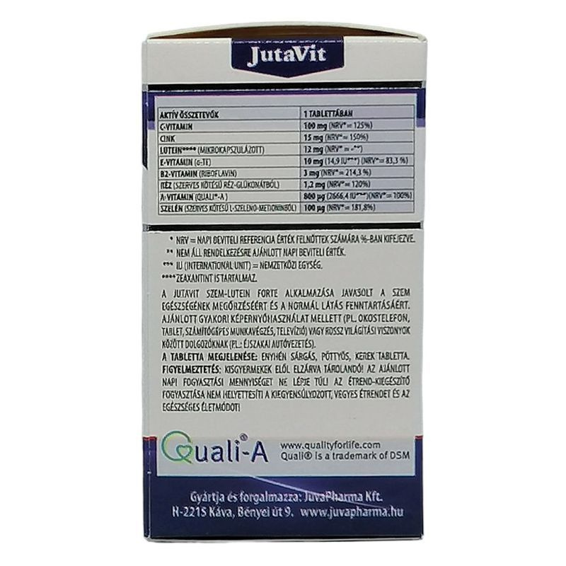 Szelén szintén antioxidáns melynek szerepe a sejtmembrán és a szövetek épségének fenntartásában és lassítja az oxidáció eredetű öregedési folyamatokat. A JutaVit Szem-Lutein Forte kapszula javasolt időskori szembetegségek (például: makuladegeneráció), illetve az erős fénysugárzás oxidatív szemkárosító hatása esetén a különleges táplálkozási igény kielégítésére. Adagolás: Felnőtteknek napi 1db tablettát reggel étkezés előtt folyadékkal egészben lenyelni.