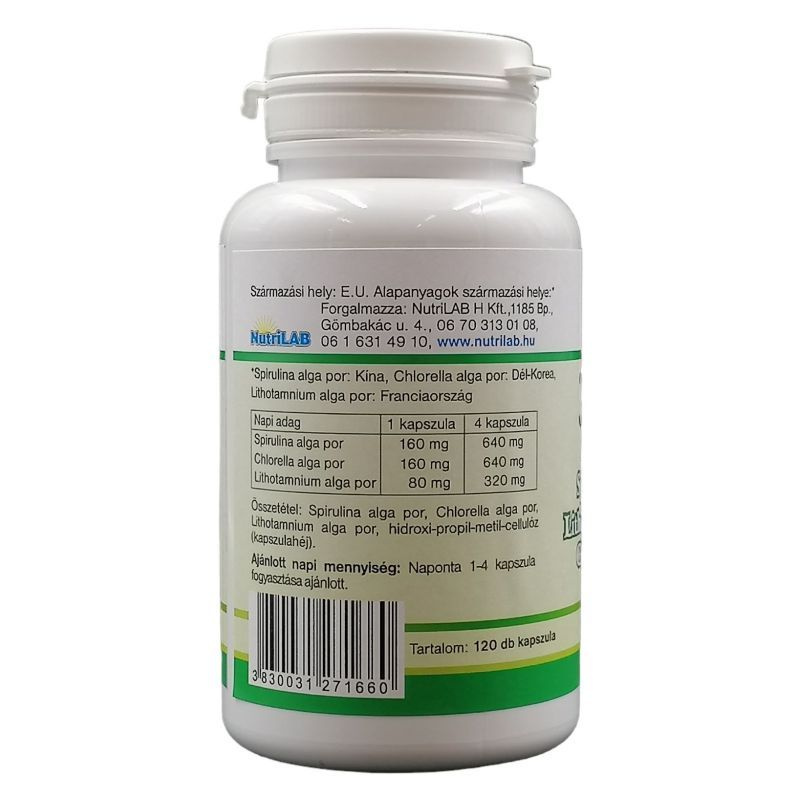 Normális táplálkozás mellett a szervezet kevesebb energiát vesz fel. Megemésztetlen keményítő halad át a beleken és elősegíti a belek aktivitását. Mi vonatkozik a magas kalcium tartalmú Alga Lithothamniumra? Kalcium fenntartja a szív egészségét. Chlorella alga miben segít? Fokozza az életerőt, energiát. Antioxidáns. Egészséges májért. Hatóanyagai: Spirulina alga por: 160 mg (kék alga), Chlorella alga por: 160 mg (zöld alga), Lithothamnium alga por: 80 mg (vörös alga). Összetevők: Spirulina alga por, Chlorella alga por, Lithotamnium alga por, maltodextrin (térfogatnövelő szer), mikrokristályos cellulóz (csomósodást gátló), szilícium-dioxid (csomósodást gátló), növényi sztearinsav (csomósodást gátló), növényi magnézium sztearát (térfogatnövelő szer). Ajánlott napi mennyiség: naponta 4 tabletta fogyasztása ajánlott. Energiatartalom: 2,8 kJ/ 0,8 kcal, Fehérje: 3,2 mg, Szénhidrát: 144,8 mg, Zsír: 13,2 mg.