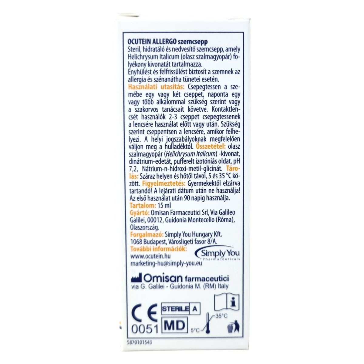 Az Ocutein Allergo szemcsepp steril, hidratáló és nedvesítő készítmény, amely segít megnyugtatni a szemeket és enyhíti az allergia és szénanátha okozta kellemetlen érzéseket. Használata kontaktlencsét viselők számára is biztonságos. A termék nem ellenjavallt homeopátiás kezeléssel, így azzal együtt is alkalmazható. A csepp használata során a helyi jogszabályoknak megfelelően kell eljárni a hulladék eltávolításakor.