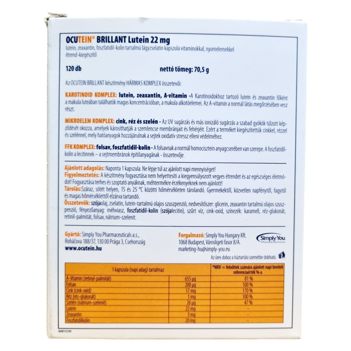 A-Vitamin (retinyl-palmitát) 655 µg (81%), Folsav 200 µg (100%), Cink (cink-oxid) 17 mg (170%), Réz (réz-glukonát) 1 mg (100%), Szelén (nátrium-szelenit) 26 µg (47%), Lutein 22 mg, Zeaxantin 3 mg, Foszfatidilkolin 20 mg