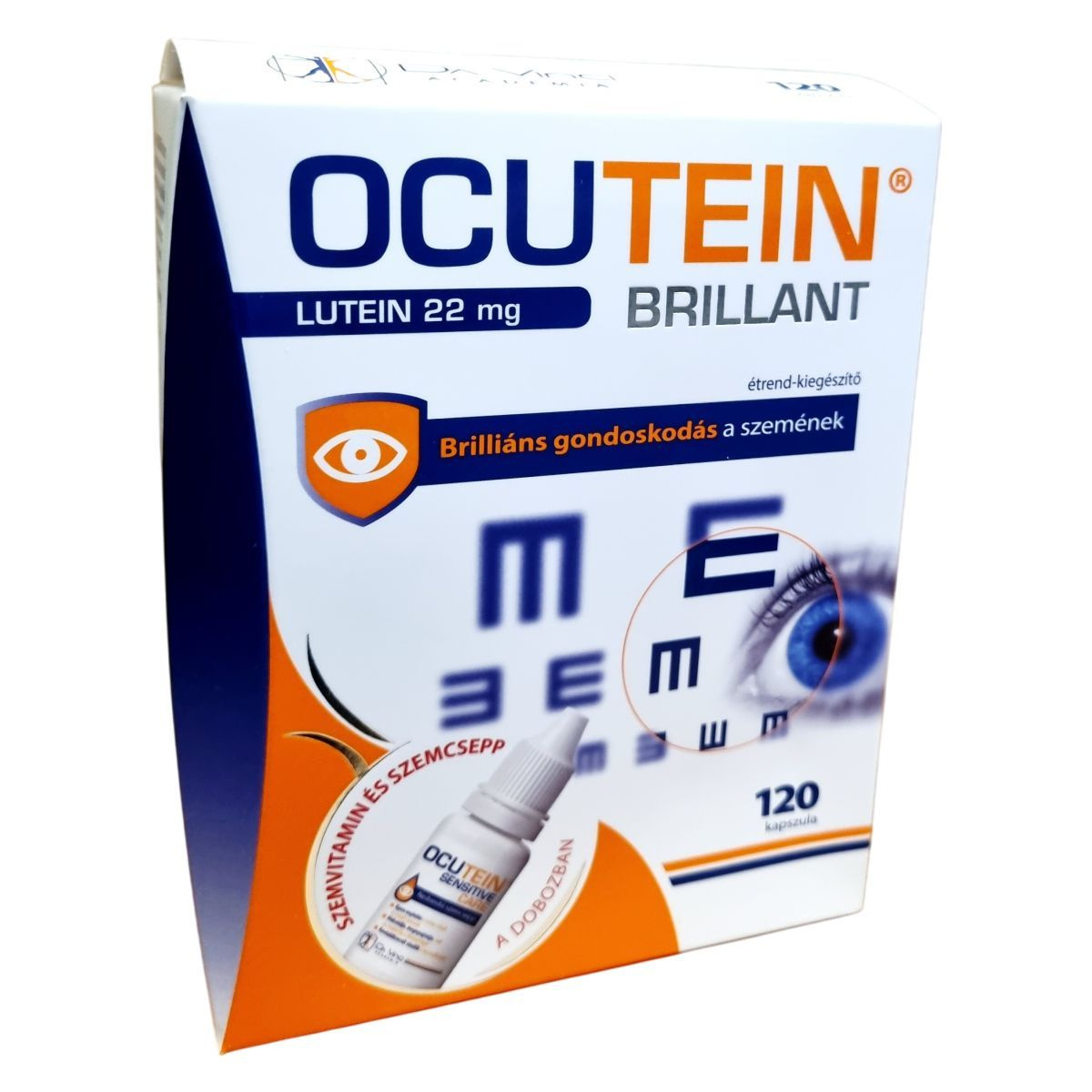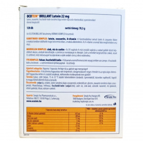 Az OCUTEIN® BRILLANT Lutein 22 mg egy étrend-kiegészítő, amely a szem egészségének támogatására szolgál. A termék három fő komplexet tartalmaz: a Karotinoid Komplexet (lutein, zeaxantin, A-vitamin), amely a normál látás megőrzésében játszik szerepet; a Mikroelem Komplexet (cink, réz, szelén), amely hozzájárul a sejtek oxidatív stressz elleni védelméhez; és az FFK Komplexet (folsav, foszfatidil-kolin), amely a normál homocisztein anyagcserében és a sejtmembránok építésében vesz részt. A termék 120 kapszulát tartalmaz, amely 4 havi adagot jelent. Az OCUTEIN SENSITIVE CARE szemcsepp is megtalálható a csomagban, amely enyhíti a szemszárazságot és az irritációt.