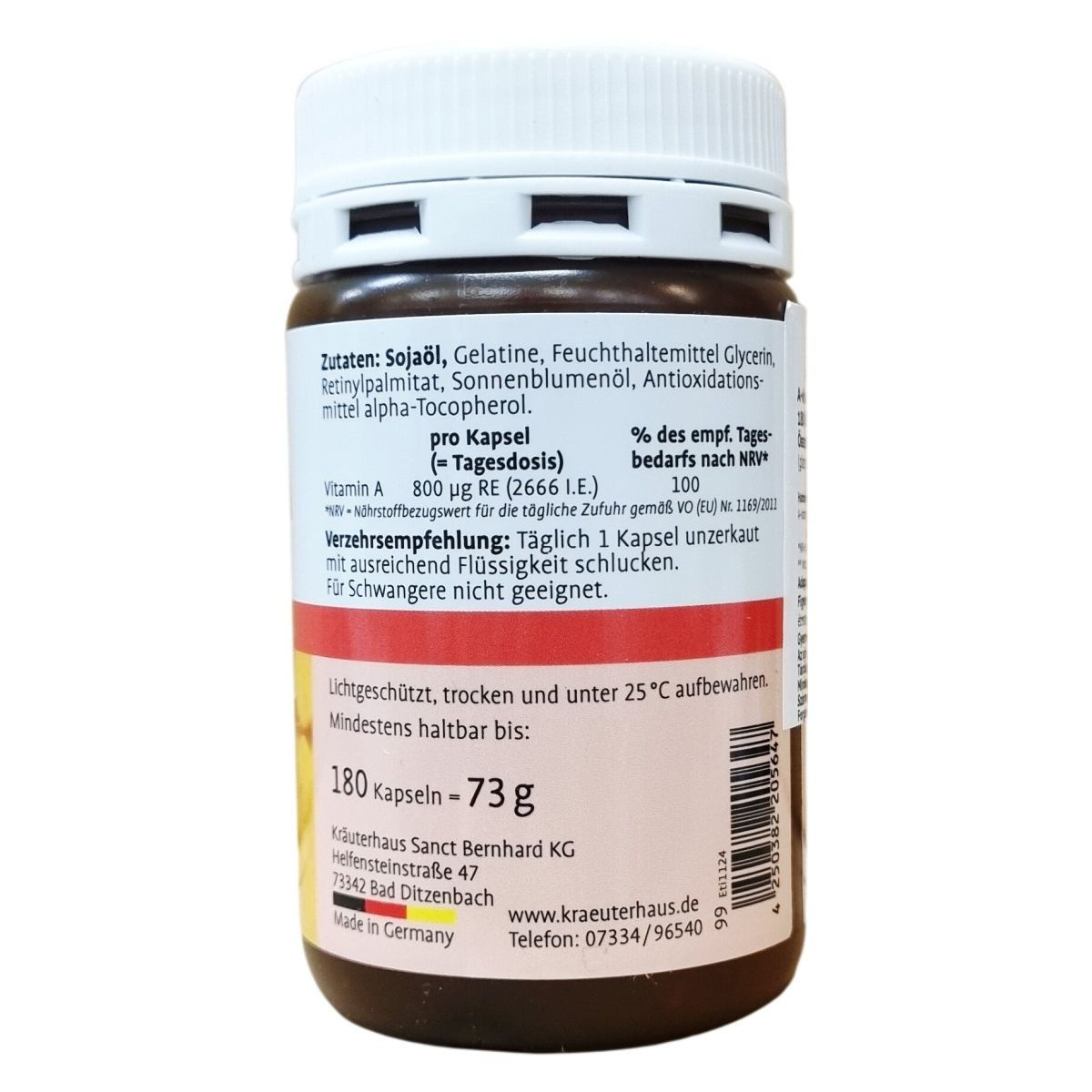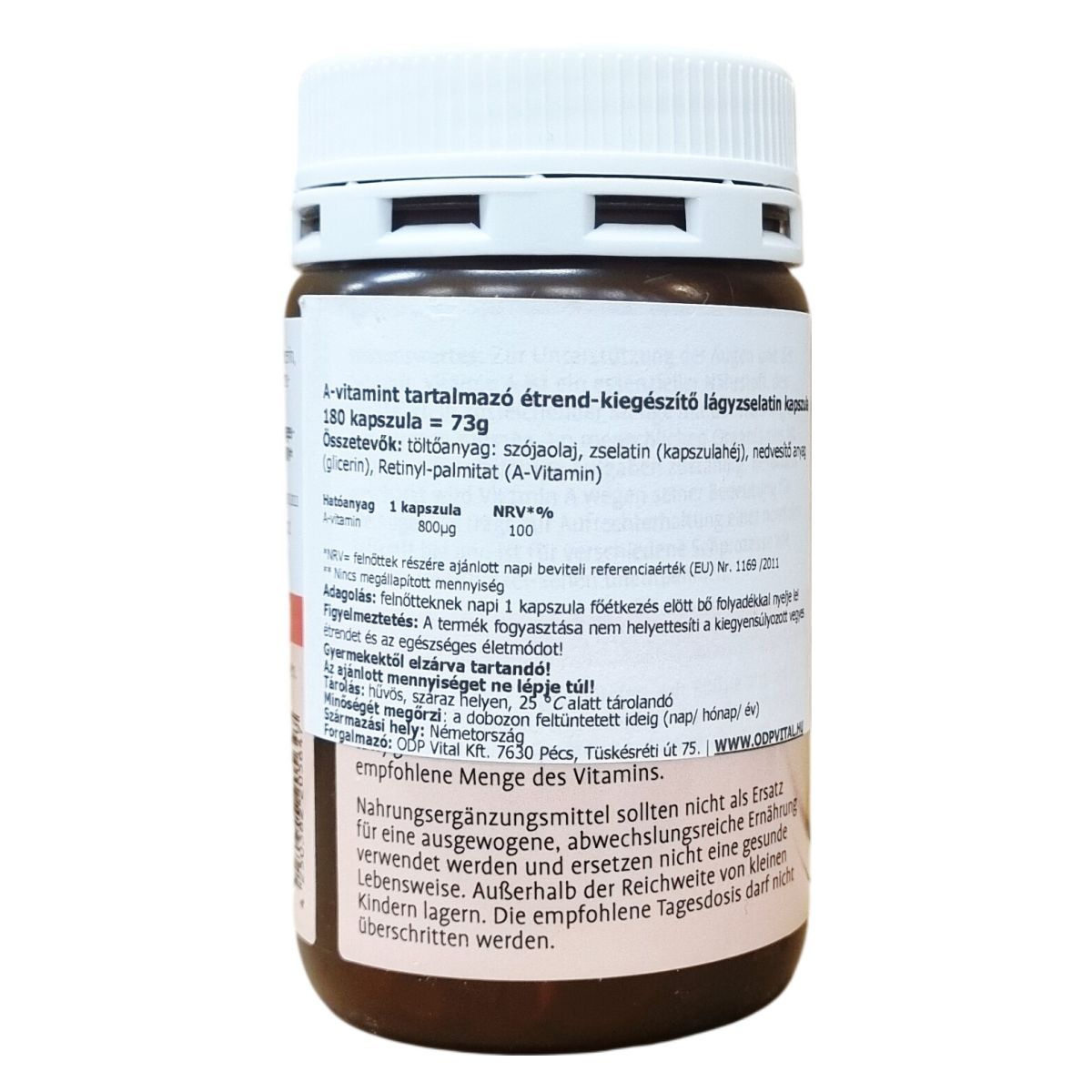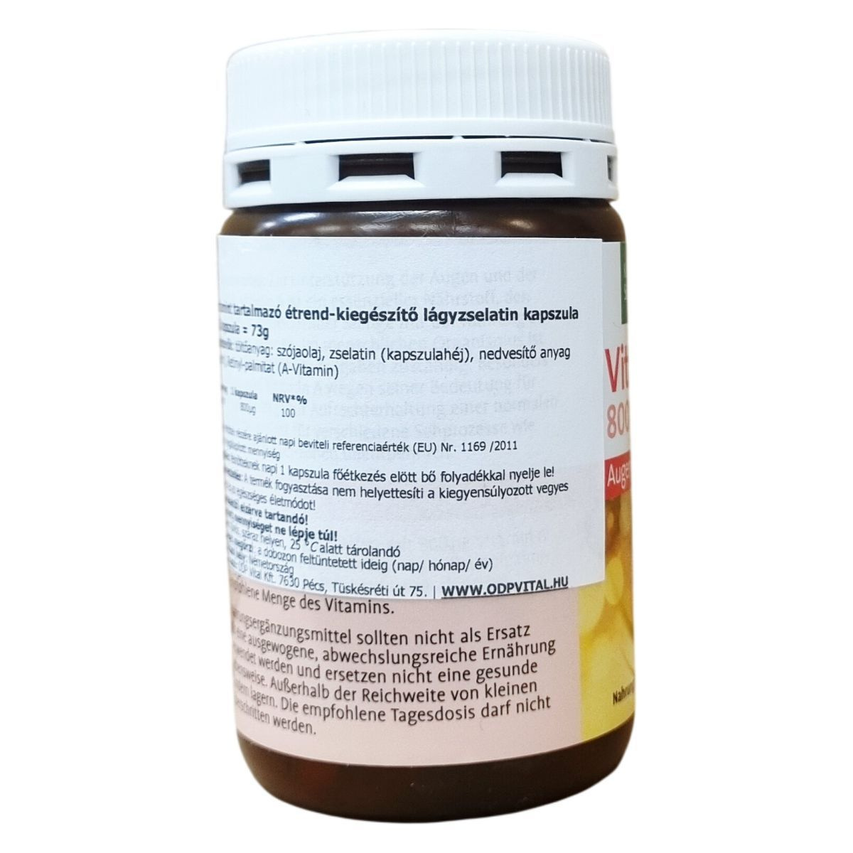 Ez az A-vitamint tartalmazó lágyzselatin kapszula egy táplálékkiegészítő, amely retinyl-palmitát formájában tartalmazza a vitamint. Egy kapszula 800 mikrogramm A-vitamint biztosít, ami a felnőttek számára ajánlott napi beviteli referenciaérték 100%-a. A termék szójaolajat, zselatint, glicerin nedvesítő anyagot, napraforgó olajat és antioxidánsként alfa-tokoferolt is tartalmaz. A kapszulákat napi egy alkalommal, főétkezés előtt kell elfogyasztani, elegendő mennyiségű folyadékkal. A terméket fénytől védve, száraz és 25 Celsius-fok alatt kell tárolni. Nem alkalmas terhes nők számára. Fontos, hogy a kapszulák fogyasztása nem helyettesíti a kiegyensúlyozott étrendet és az egészséges életmódot, valamint gyermekektől elzárva kell tartani. A termék Németországban készült.