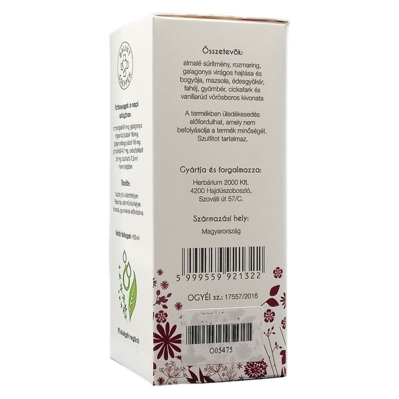 Összetevők: almalé sűrítmény, rozmaring, galagonya virágos hajtása és bogyója, mazsola, édesgyökér, fahéj, gyömbér, cickafarkfű és vaníliarúd vörösboros kivonata. Tápanyagok a napi adagban: rozmaringból 61 mg, galagonya virágos hajtásából 18 mg, galagonya bogyójából 18 mg, gyömbérből 4,7 mg, cickafarkból 3,6 mg található 7,5 ml mennyiségben. Fogyasztási javaslat: felnőtteknek naponta 1x7,5 ml hígítás nélkül.