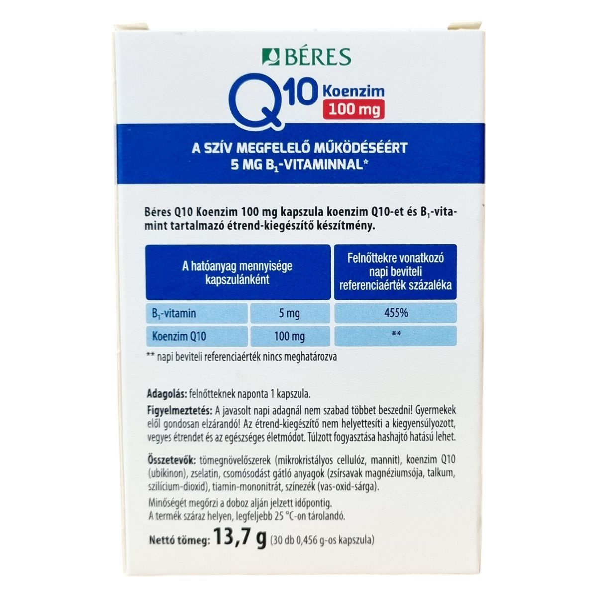 A Béres Q10 Koenzim 100 mg kapszula KANEKA Q10-et tartalmaz, amely fermentációval (élesztős erjesztéssel) előállított, gyógyszerkönyvi minőségű, all-transz formájú hatóanyag. A koenzim Q10 egy vitaminszerű anyag, amely a szervezet minden élő sejtjében jelen van; koncentrációja a szívben, a májban, a vesében és az izomszövetben a legmagasabb. Az életkor előrehaladtával a szervezet Q10 termelése fokozatosan csökken, ezért ezen időszakban javasolt fokozottan ügyelni a megfelelő bevitelre. A B1-vitamin hozzájárul a szív megfelelő működéséhez.