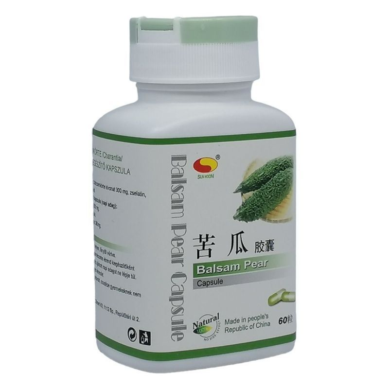 A balzsamkörte kivonata jelentős hatással van a glükóz-anyagcsere egyensúlyára. Mind a hagyományos kínai orvoslásban, mind az indiai Ayurvéda-gyógyászatban, méregtelenítésre és az anyagcsere-problémák kezelésére használják. A mediterrán területeken a napszúrás elleni hatása miatt kedvelik. Modern kutatások kimutatták, hogy hatóanyagai vértisztító, illetve koleszterinszint- és vércukorszint-stabilizáló, illetve csökkentő hatással is rendelkeznek. A keserűdinnye, vagy más néven balzsamkörte, egy a trópusi éghajlaton termő zöldségféleség. Hasonlóan a többi természetes eredetű népi gyógyszerhez többféle betegség gyógyítására használják. A különböző készítmények hatásai között azonban mindenütt szerepel a vér cukorszintjének csökkentése, illetve a cukorháztartás optimalizálása, de jelentős a koleszterin-, triglicerid-szint csökkentő hatás is. A keserűdinnye gyógyhatása a tradicionális kínai gyógyászatban ugyancsak igen régóta ismert. A tudományos vizsgálatok megállapították, hogy a hatásért egy flavonoid típusú vegyület, illetve vegyületcsoport a charantin a felelős. A termésben ez az anyag csak néhány tized százalékban fordul elő, azonban a termés húsából sikerült egy speciális eljárással 10 % feletti charantin tartalmú kivonatot előállítani. Az így nyert kivonatból már napi 1g körüli mennyiség elegendő a kívánt eredmény eléréséhez. Ez a termék tisztán növényi eredetű anyagot tartalmaz és már egy hónapos kúra jelentősen hozzájárul a szervezet ideális cukorszintjének eléréséhez. Összetevők: balzsamkörte kivonat 300 mg/kapszula, zselatin, színezék: titánium-dioxid. Alkalmazási javaslat: naponta 3x2 kapszula. Az ajánlott mennyiséget ne lépje túl. A termék összetevői hozzájárulnak a megfelelő fizikai és szellemi erőnlét fenntartásához. Nem helyettesíti a vegyes étrendet, és a kiegyensúlyozott életmódot. Fogyasztása gyermekeknek, terhes és szoptatós anyáknak nem ajánlott! A termék kisgyermekek elől elzárva tartandó! Tárolás: száraz hűvös helyen.