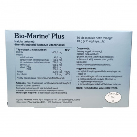 A Bio-Marine® Plus kapszula halolaj tartalmával, továbbá folsav és B12 vitamin bevitelével járulhat hozzá a szív megfelelő működéséhez, a normál látás és agyműködés fenntartásához, valamint a normál homocisztein anyagcseréhez. A termék gyógyszergyártási gyakorlat szerint előállított és ellenőrzött, minősített étrend-kiegészítő. A kapszulák antioxidánsokkal együtt alkalmazva ajánlottak. Egy kapszula nettó tömege 715 mg, a dobozban 60 darab található.
