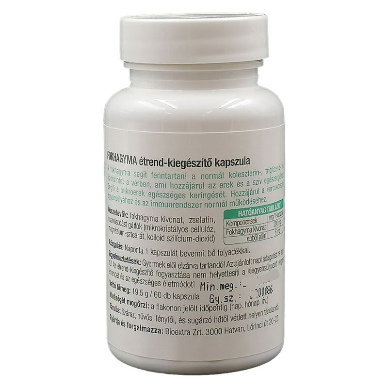 A Bioextra Fokhagyma kapszula hatóanyagai segítenek fenntartani a normál koleszterin-, triglicerid- és lipidszintet a vérben, ami hozzájárul az erek és a szív egészségéhez. Segítik a mikroerek keringését, hozzájárulnak a vércukorszint egyensúlyához és az immunrendszer normál működéséhez. vörös színű kapszula: L-karnitin-tartarát, zselatin, koenzim Q10, csomósodástgátlók (magnézium-sztearát, talkum), színezékek (eritrozin, titán-dioxid, indigókármin) Sárga színű kapszula: tengeri halolaj, zselatin, glicerin, nem kristályosodó szorbit oldat: Fokhagyma kivonat, zselatin, csomósodástgátlók (mikrokristályos cellulóz, magnézium-sztearát, kolloid szliícium-dioxid). x: 200 mg fokhagyma kivonat, ebből 6 mg alliin. 7070/2010: 16299/2015.