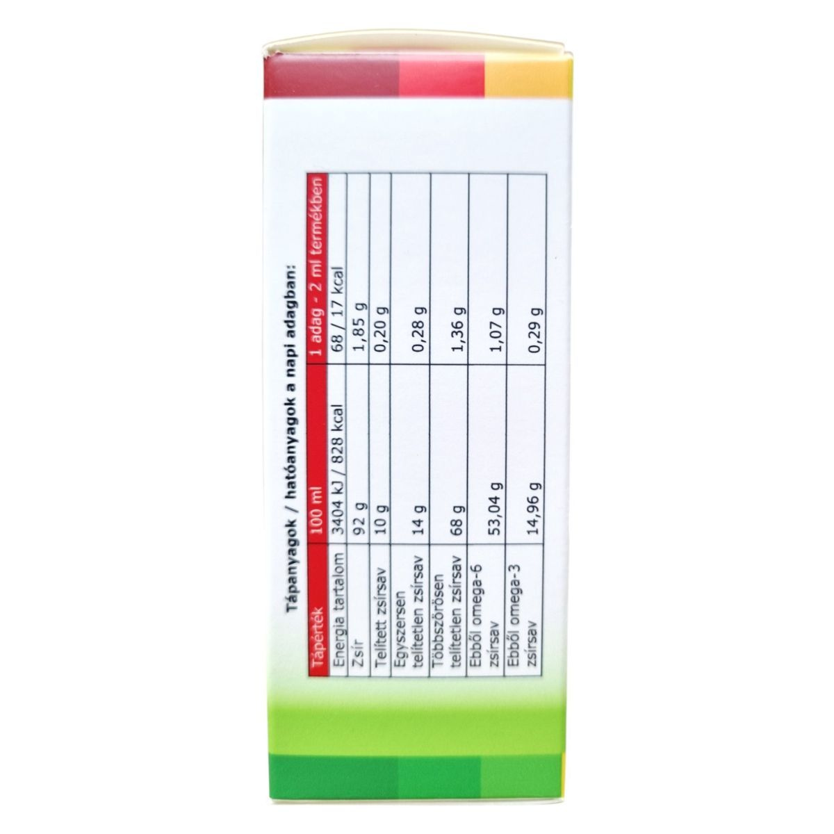 Zsír: 1.85 g, ebből telített zsírsav: 0.20 g, egyszeresen telítetlen zsírsav: 0.28 g, többszörösen telítetlen zsírsav: 1.36 g