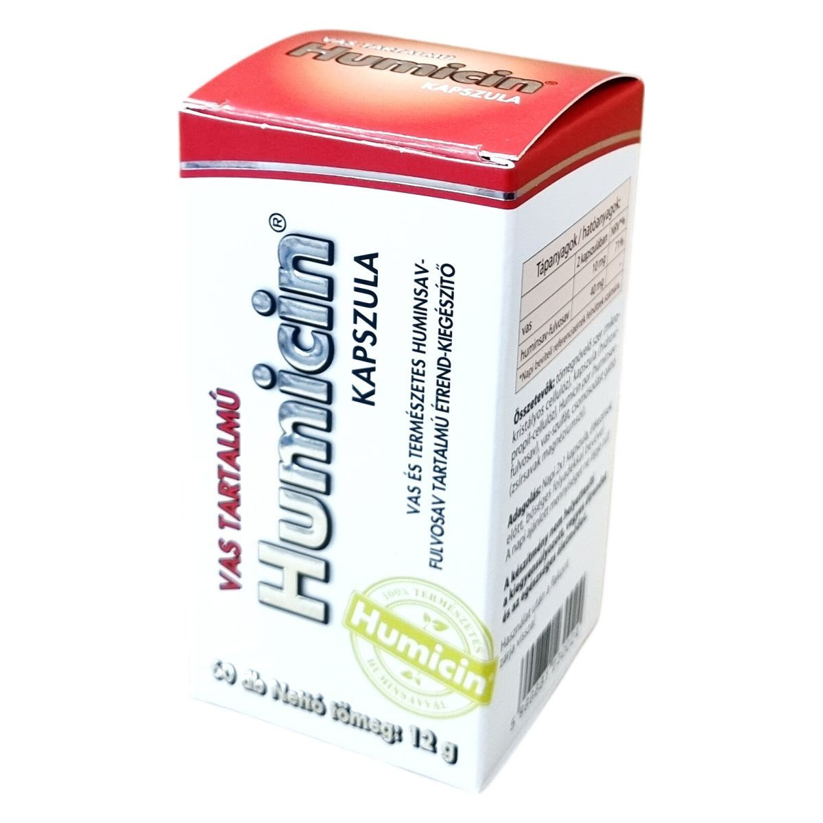 A Humicin® kapszula egy olyan étrend-kiegészítő, amely természetes huminsav-fulvosavat és vasat tartalmaz. A benne található vas a szervezet normál oxigénszállításában vesz részt, hozzájárulhat a normál vörösvérsejt- és hemoglobinképződéshez, valamint az immunrendszer megfelelő működéséhez. A termék fogyasztása elsősorban kiegyensúlyozatlan táplálkozás, szigorú diéta vagy vegetáriánus étrend esetén javasolt. A kapszula dózisa napi két alkalommal egy-egy kapszula, melyet étkezések előtt célszerű bőséges folyadékkal bevenni. A termék összetételében megtalálhatók a természetes huminsav-fulvosav keverék, vas-szulfát, mikrokristályos cellulóz, hidroxi-propil-cellulóz, valamint csomósodást gátló anyagok. A termék nem helyettesíti a kiegyensúlyozott étrendet és az egészséges életmódot.