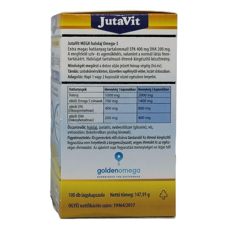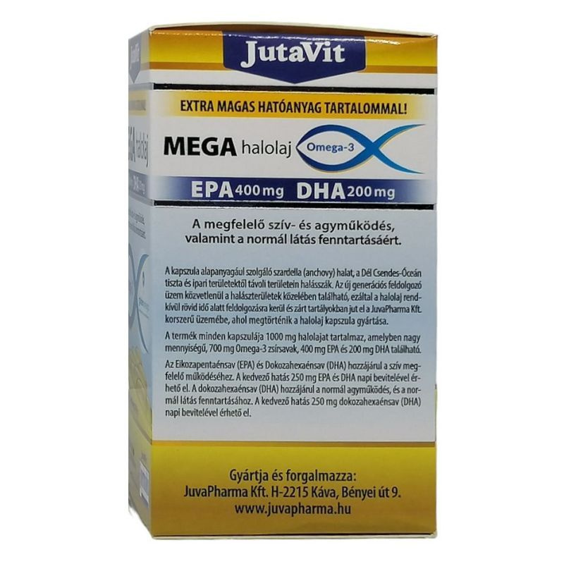 JutaVit MEGA halolaj Omega-3 extra magas hatóanyag tartalmú (EPA 400 mg DHA 200 mg) halolajat tartalmazó étrend-kiegészítő készítmény.