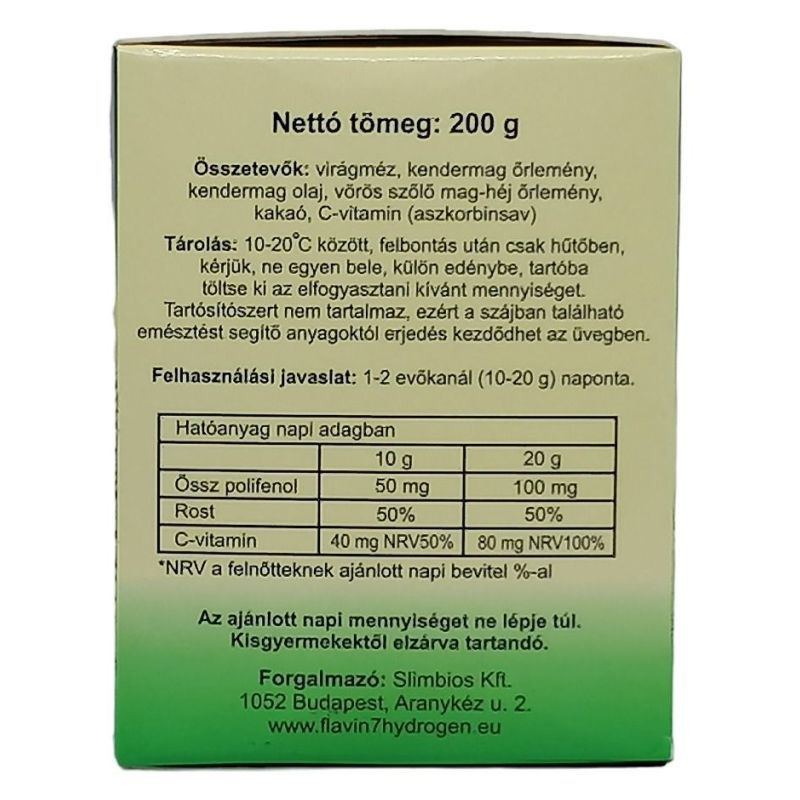 A kendermag rostjainak hatása: rákmegelőző, továbbá késlelteti az öregedési folyamatokat, erősíti a látást, ajánlott vashiányos állapotokban, savtúltengésre, de gyulladáscsökkentő hatással is rendelkezik. Szabályozza a vércukorszintet, a zsíranyagcserét. Erősíti az erek falát, a tüdő kötőszöveti rendszerét, az emésztőrendszert, emellett segít a fogszuvasodás megelőzésében és a fogzománc megvédésében. Ezeket a tulajdonságait kiegészíti, hogy védi a kollagénanyagcserét, és serkenti az immunrendszert. Rostban gazdag élelmi anyagok nélkülözhetetlenek a tápcsatorna egészséges működéséhez, a fel nem szívódó elemek képezik ugyanis azt a ballasztanyagot, amely a beleket kitöltve lehetővé teszi a béltartalom folyamatos továbbítását. Rostdús táplálékaink emellett életfontosságú vitaminokat és ásványi anyagokat is tartalmaznak. A rostos élelmiszerek alapvető D-vitaminforrásunkat jelentik, többségükben található A- és E-vitamin, sot életfontosságú nyomelemek is. Ezek az életfontosságú nyomelemek gátolják a rosszindulatú folyamatokat, és segítik azok megelőzését. Összetételénél fogva a vérkeringési zavarokat is csökkenti, és gátolja az öregedést. Életfontosságú anyagai az A- és E-vitamin, a szelén, de jelentos a kalcium, magnézium, vas, cink, mangán, réz és krómtartalma, sot az összes B-vitamin mellett folsav is található benne. Összetevők: kendermag őrlemény, gesztenyeméz, hársméz, vörös szőlő mag-héj őrleménye, szőlőmag olaj, kakaó, C-vitamin, aszkorbinsav. Javasolt fogyasztás: 1-2 evőkanállal (10-20g) naponta. Az ajánlott napi mennyiséget ne lépje túl. Étrend-kiegészítő nem helyettesíti a vegyes étrendet és az egészséges életmódot!