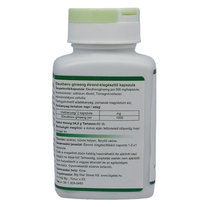 Az Eleuthero Ginzeng kapszula fokozza a vérkeringést, szabályozza az anyagcserét. Biztosítja a szervezet energia-utánpótlását élsportolók vagy nehéz fizikai munkát végzőknek is ajánlott, illetve a szexuális vágy fokozására áhítozók részesítik előnyben. Alkalmazási javaslat: Napi kétszer két Eleuthero Ginzeng kapszula szedése javasolt. Összetétel: Eleuthero Ginzeng gyökér por 500mg/kapszula. Hordozószer: szilicium dioixid. Tömegnövelő: mikrokristályos cellulóz. Tárolás: Száraz, hűvös helyen. Összetevők: Eeleuthero ginseng gyökér kivonat 220mg/kapszula, zselatin.