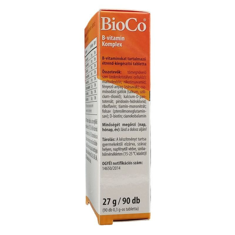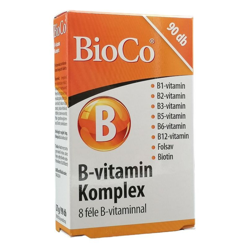 A B-vitaminokat "szépségünk forrása"-ként is emlegetik, hiszen egyes B-vitaminok (B2-, B3-vitaminok) fontos szerepet töltenek be a bőr, a biotin a haj normál állapotának fenntartásában. Adagolás: Felnőttek számára napi 1 tabletta szedését javasoljuk. A tablettát bő vízzel nyeljük le! Hatóanyagok 1 tablettában: B1-vitamin (tiamin) 1,1 mg, B2-vitamin (riboflavin) 1,4 mg, B3-vitamin (niacin) 16 mg, B5-vitamin (pantoténsav) 6 mg, B6-vitamin (piridoxin) 1,4 mg, B9-vitamin (folsav) 200 µg, B12-vitamin 2,5 µg, Biotin 50 µg. Összetevők: tömegnövelő szer (mikrokristályos cellulóz); maltodextrin; csomósodást gátlók (talkum, szilícium-dioxid); nikotinamid (B3-vitamin); kalcium-D-pantotenát (B5-vitamin); piridoxin-hidroklorid (B6-vitamin); riboflavin (B2-vitamin); tiamin-mononitrát (B1-vitamin); folsav (B9-vitamin); D-biotin; cianokobalamin (B12-vitamin). 27 g/ 90 db. OÉTI notifikációs szám:14650/2014. Tárolás: gyermekektől elzárva, száraz, hűvös, sötét helyen. Minőségét megőrzi (nap, hónap, év): lásd a doboz alján. Figyelmeztetés: Az étrend-kiegészítő fogyasztása nem helyettesíti a kiegyensúlyozott, változatos, vegyes étrendet, és az egészséges életmódot! Ne fogyasszon a napi ajánlott mennyiségnél többet! A készítményt tartsa gyermekektől elzárva! A "BioCo" bejegyzett cégnevet, és nem ökológiai tanúsítást jelent!