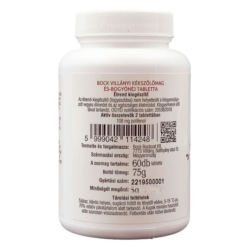 Hogyan fogyasszuk a Bock Kékszőlőmag és -bogyóhéj Tablettát? Mindössze napi 2X1 tabletta már tartalmazza a szakirányú kutatások alapján a felnőttek számára ajánlott, napi optimális hatóanyag (polifenol) mennyiséget. Ezen mennyiség tartalmazza a szakirányú kutatásokból ismert napi optimális hatóanyag felszívódásához elegendő szőlőmag- és bogyóhéj mikroőrleményt. Az ajánlott napi fogyasztási mennyiséget ne lépje túl!