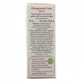 A Gránátalma Forte kapszula gránátalma gyümölcs kivonatot, valamint rózsagyökér és vörös zsályagyökér kivonatot tartalmaz. A gránátalma gazdag flavonoid- és polifenol-tartalmú növény, kivonata koncentrált formában biztosítja az értékes összetevőket. A rózsagyökér hagyományosan fogyasztott gyógynövény, amely hozzájárulhat a keringési rendszer normál működéséhez, a sejtek oxigén- és tápanyagellátásához, valamint a megfelelő szellemi és fizikai állapot fenntartásához. A vörös zsályagyökér segítheti az érrendszer egészségének megőrzését és az egészséges vérnyomás kialakulását. Egy kapszula gránátalma kivonata 5400 mg gránátalma gyümölcs őrleménynek felel meg.
