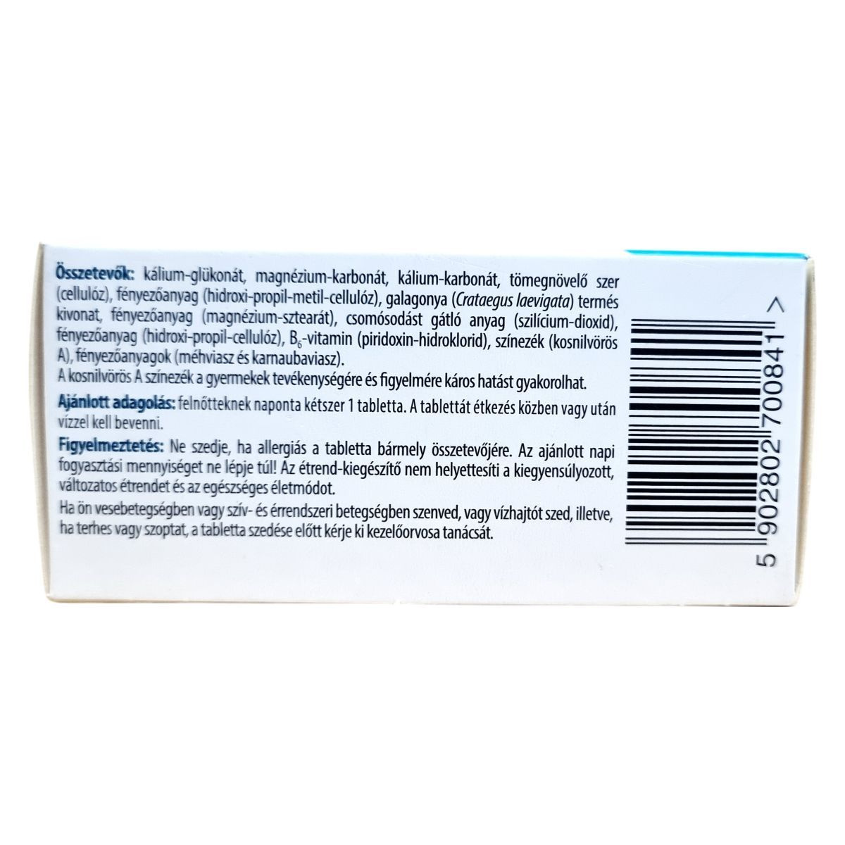 kálium-glükonát, magnézium-karbonát, kálium-karbonát, tömegnövelő szer (cellulóz), fényezőanyag (hidroxi-propil-metil-cellulóz), galagonya (Crataegus laevigata) termés kivonat, fényezőanyag (magnézium-sztearát), csomósodást gátló anyag (szilícium-dioxid), fényezőanyag (hidroxi-propil-cellulóz), B6-vitamin (piridoxin-hidroklorid), színezék (kosnilvörös A), fényezőanyagok (méhviasz és karnaubaviasz).
