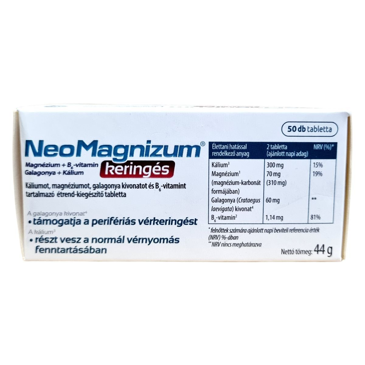 A NeoMagnizum® tabletta magnéziumot, B6-vitamint, galagonya kivonatot és káliumot tartalmaz, amelyek támogathatják a normál vérkeringést és vérnyomást, valamint hozzájárulhatnak az idegrendszer és az izomműködés megfelelő működéséhez.